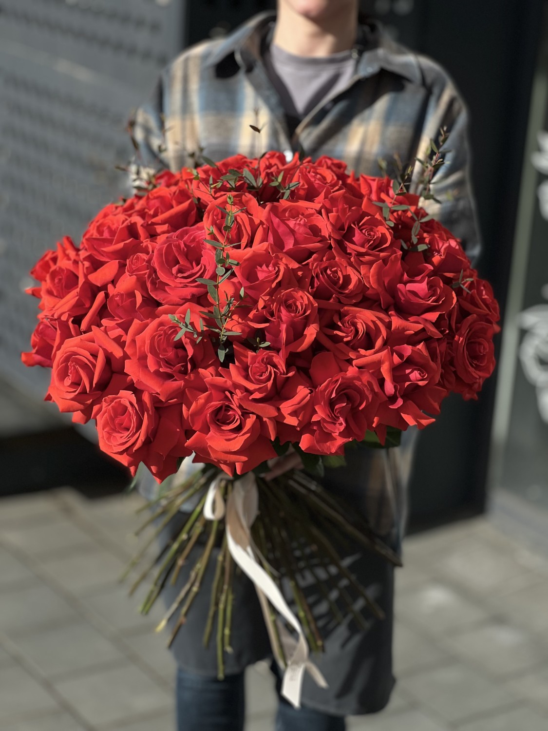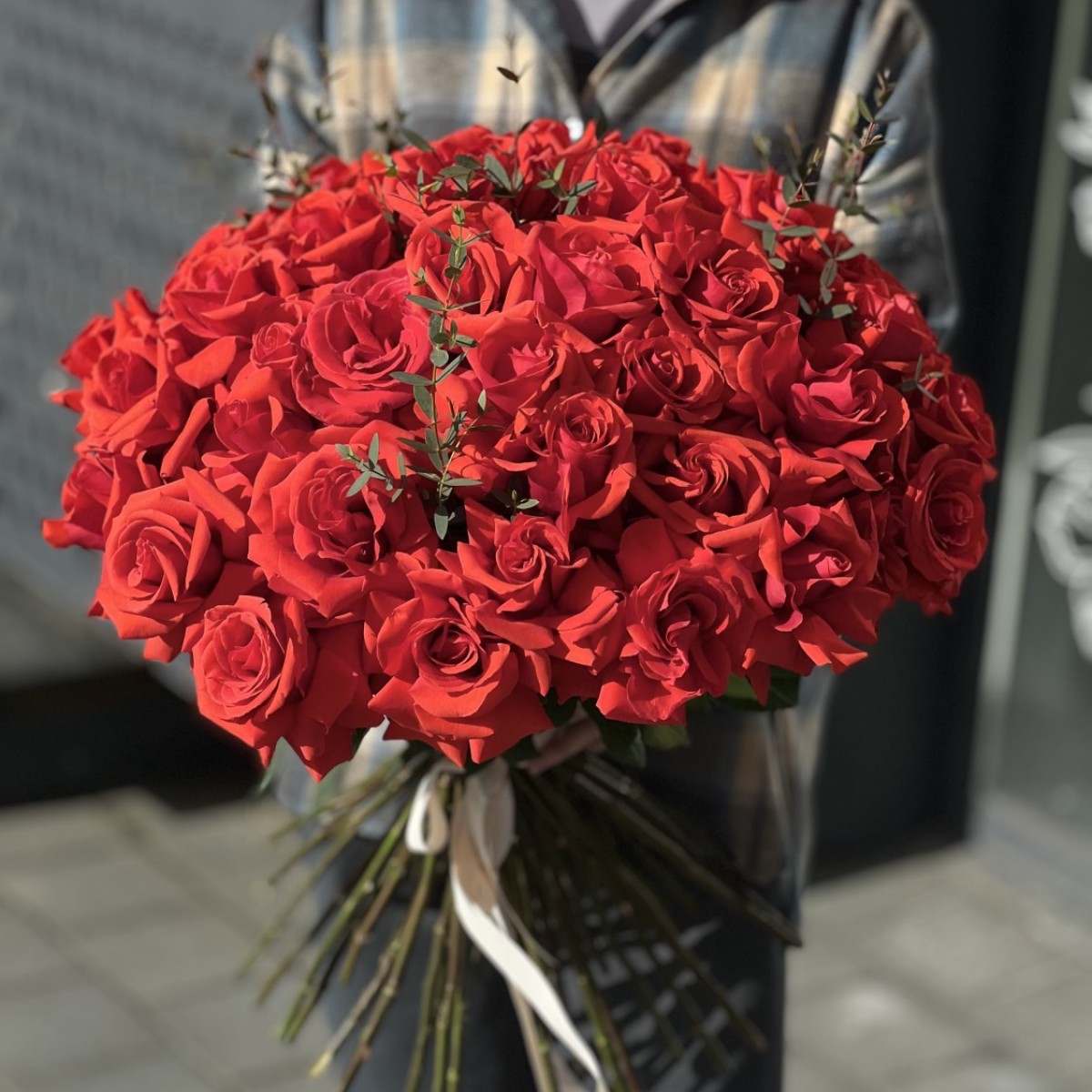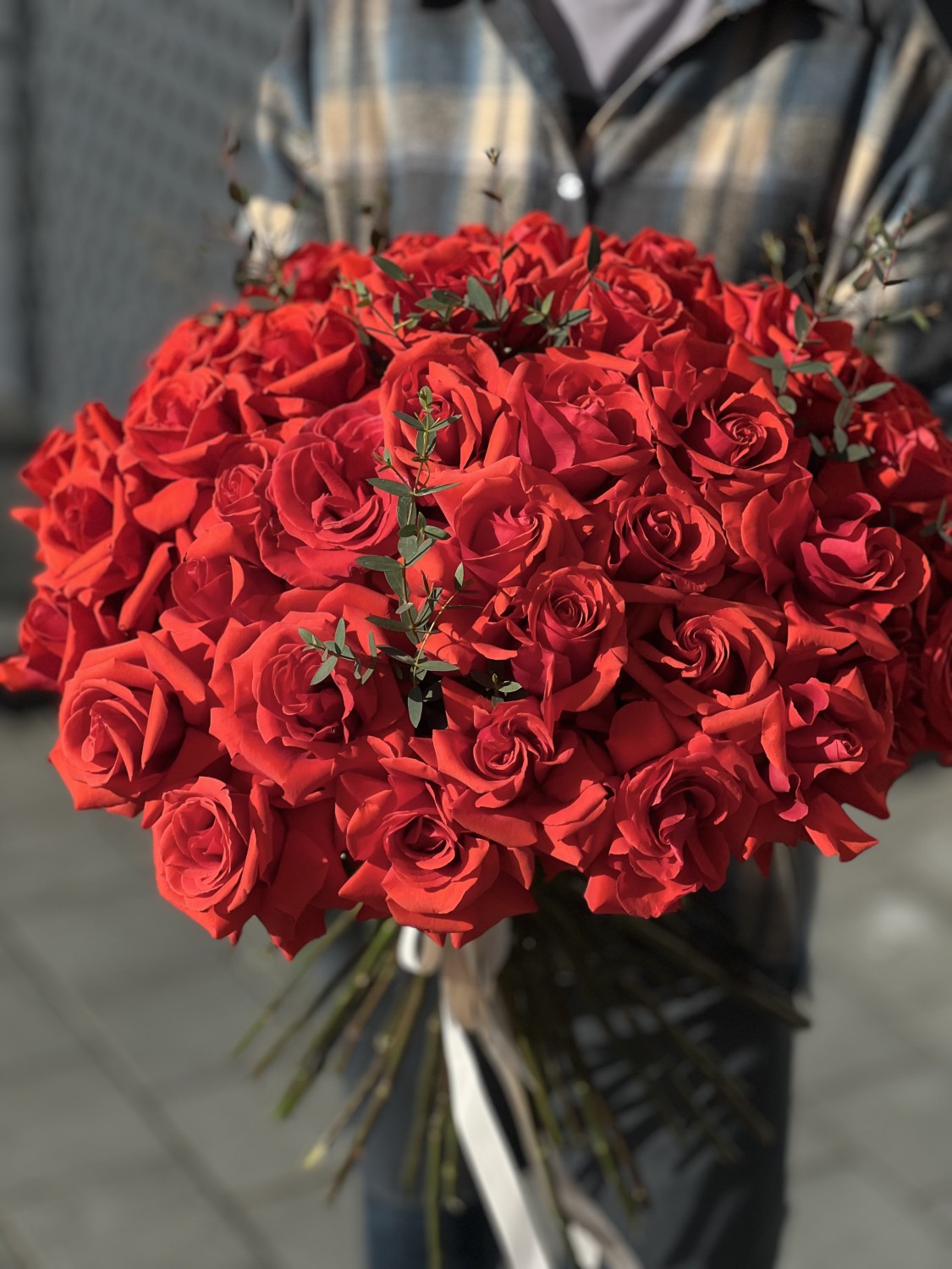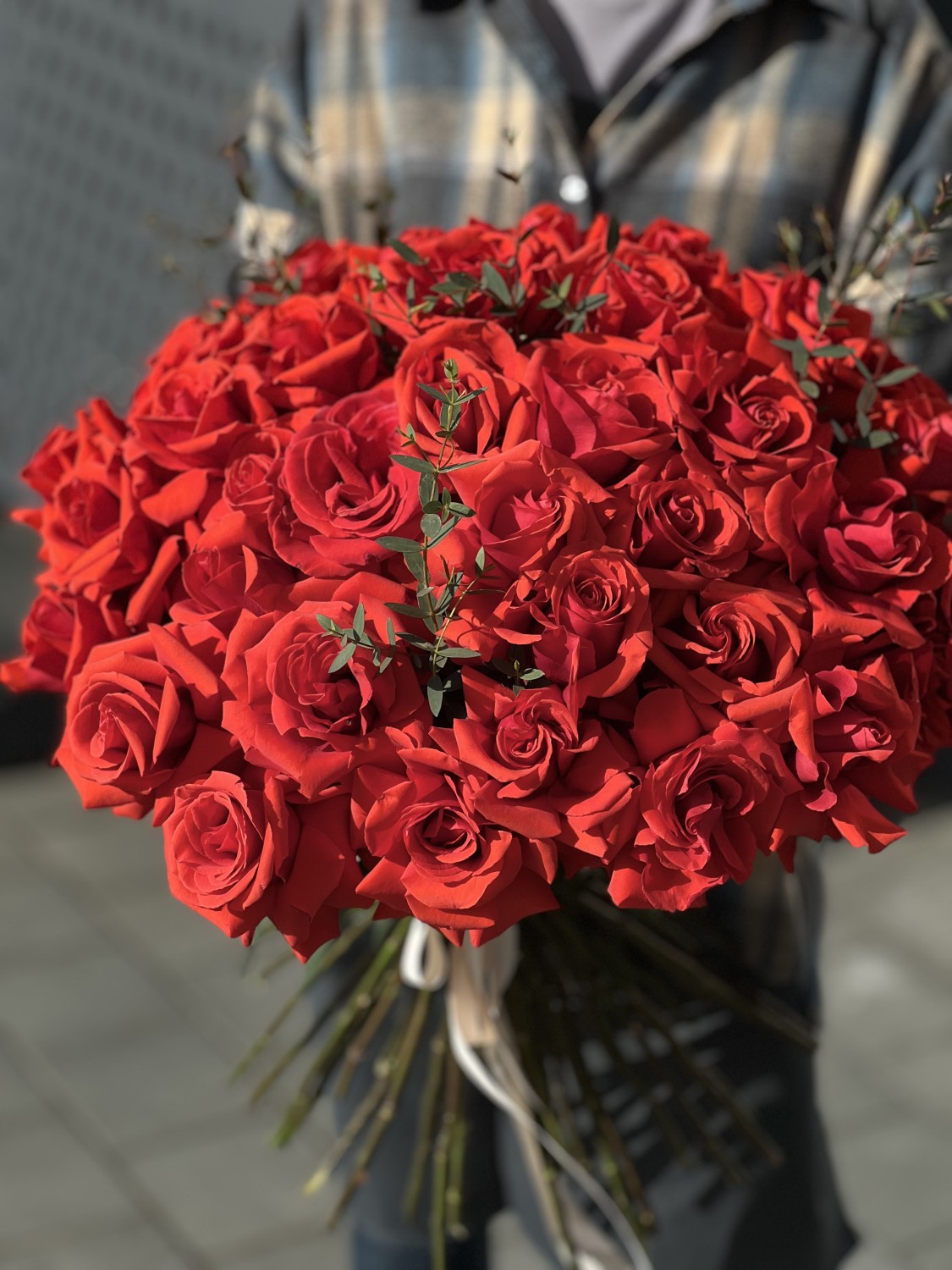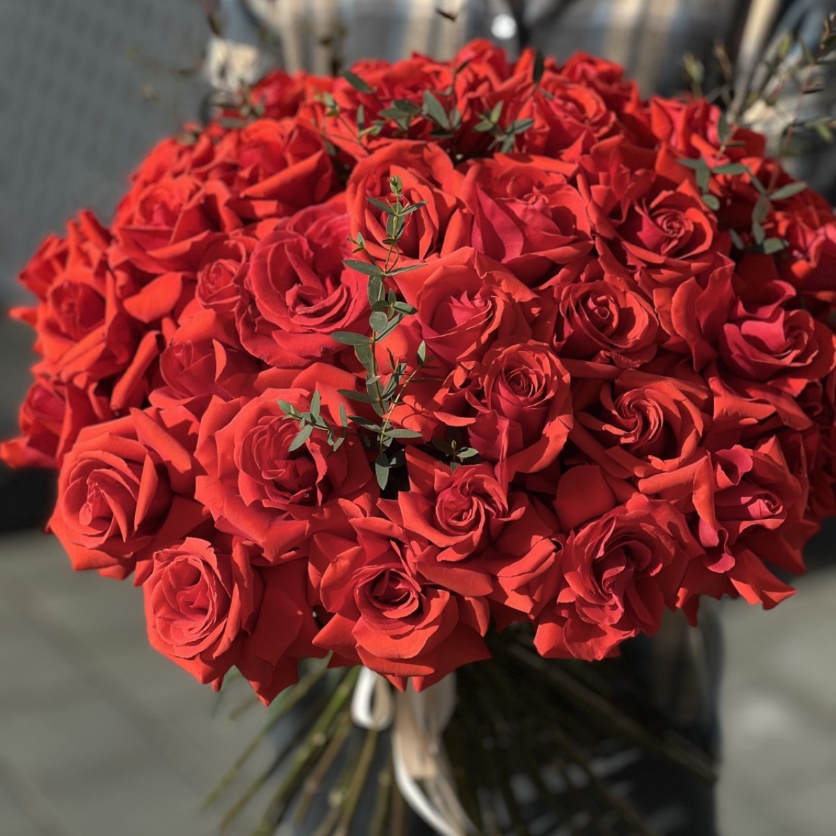 Букет французских роз сорта Нина с веточками эвкалипта. Просто и изысканно. Подходит для юбилея, дня рождения и романтической встречи.