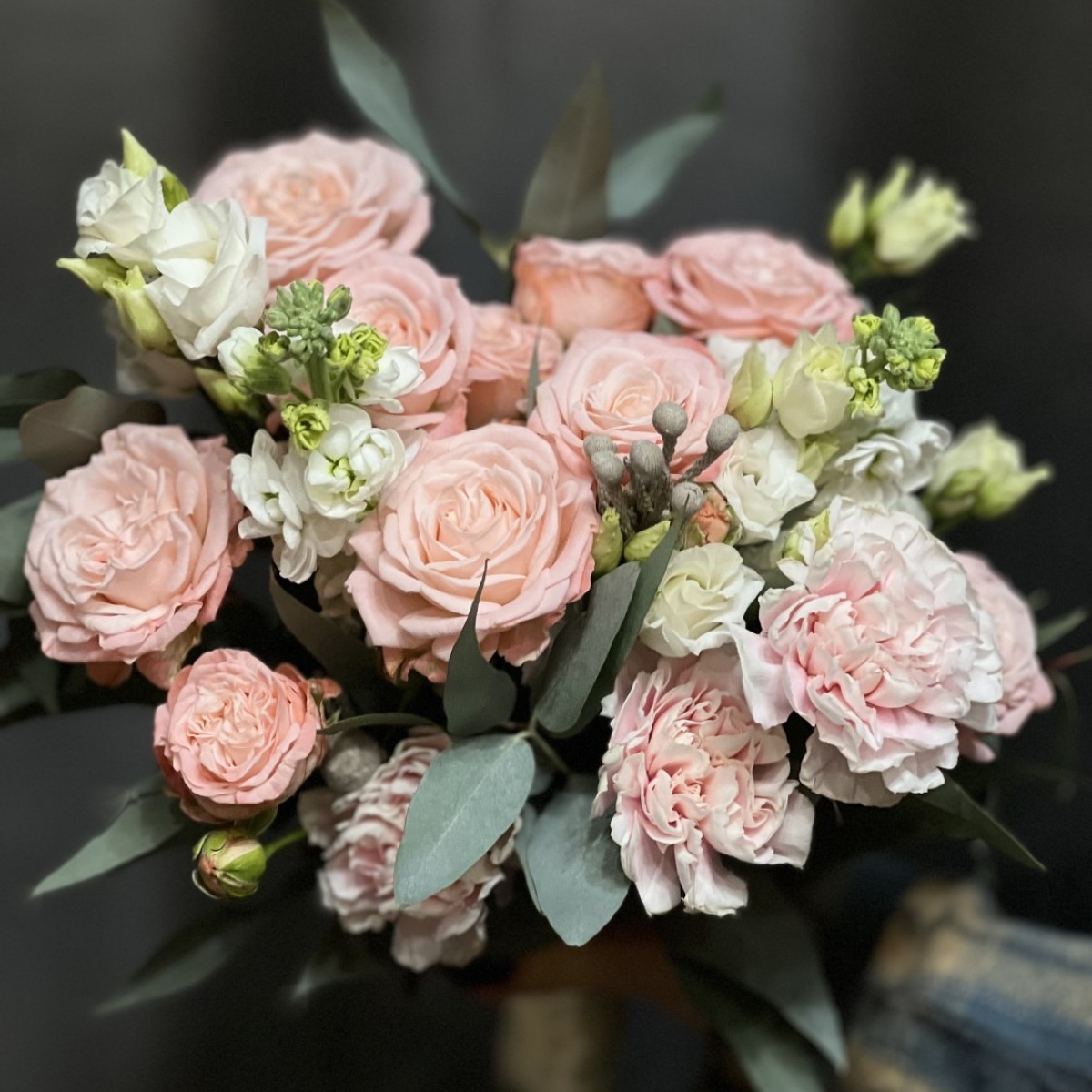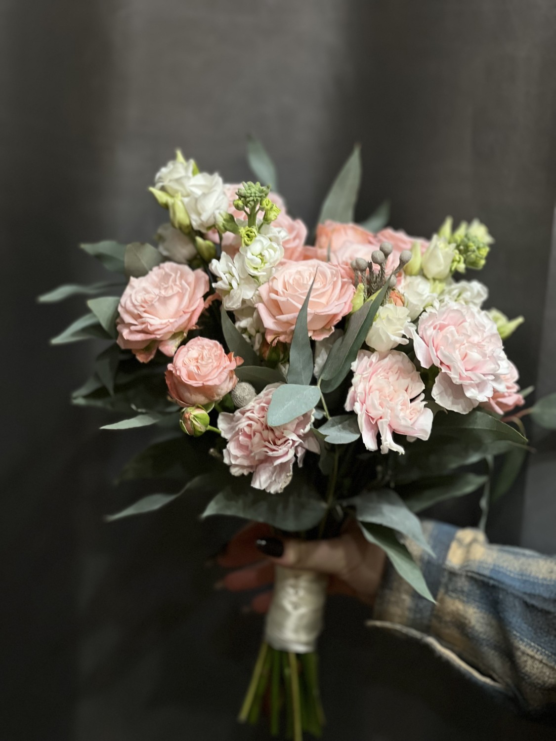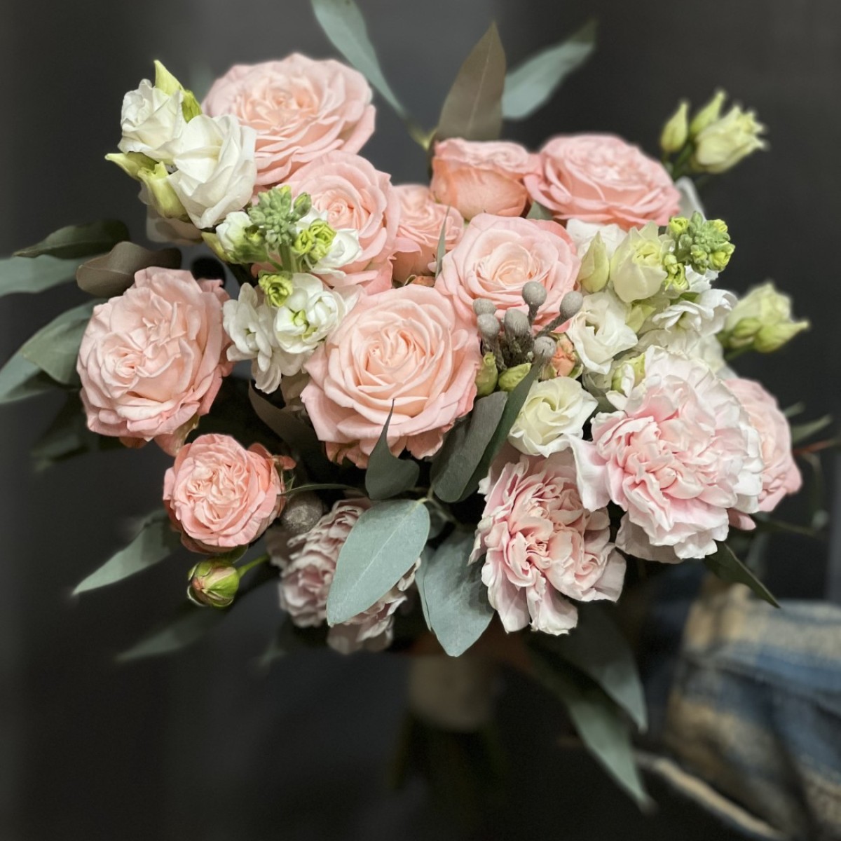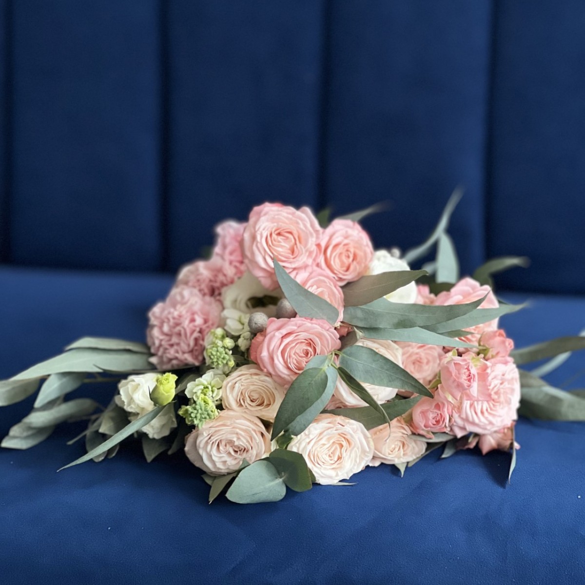 Стильный букет невесты собран из кустовой розы сорта Мадам Бомбастик, белой эустомы и нежнейших диантусов кремово-розового оттенка с добавление веточек эвкалипта и брунии. Раскидистая форма букета выгодно выделяется и дополнит образ.