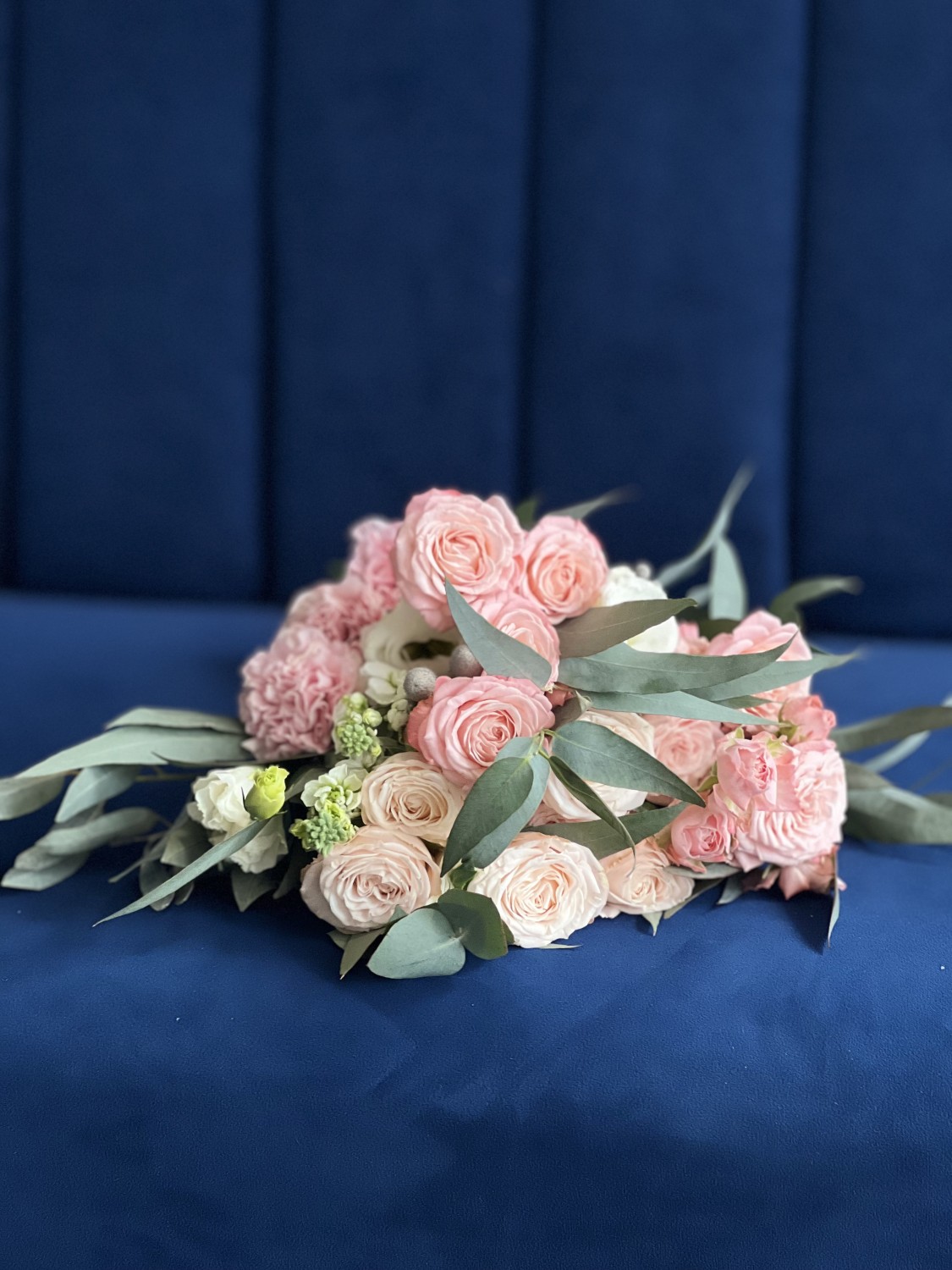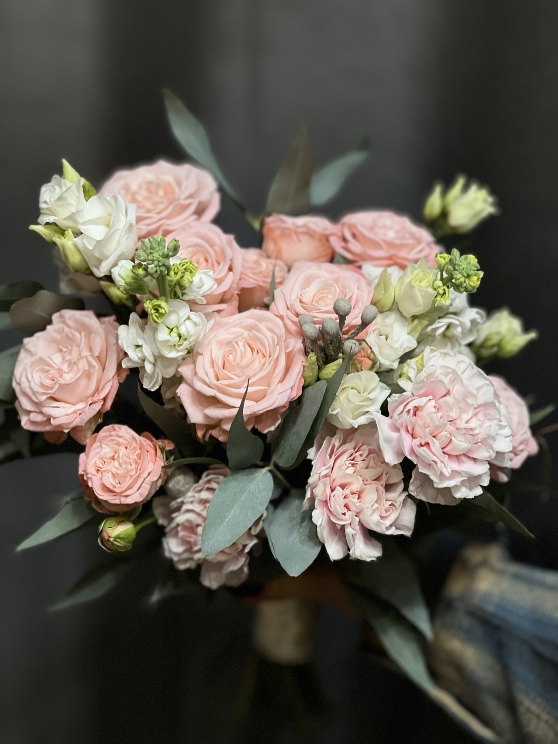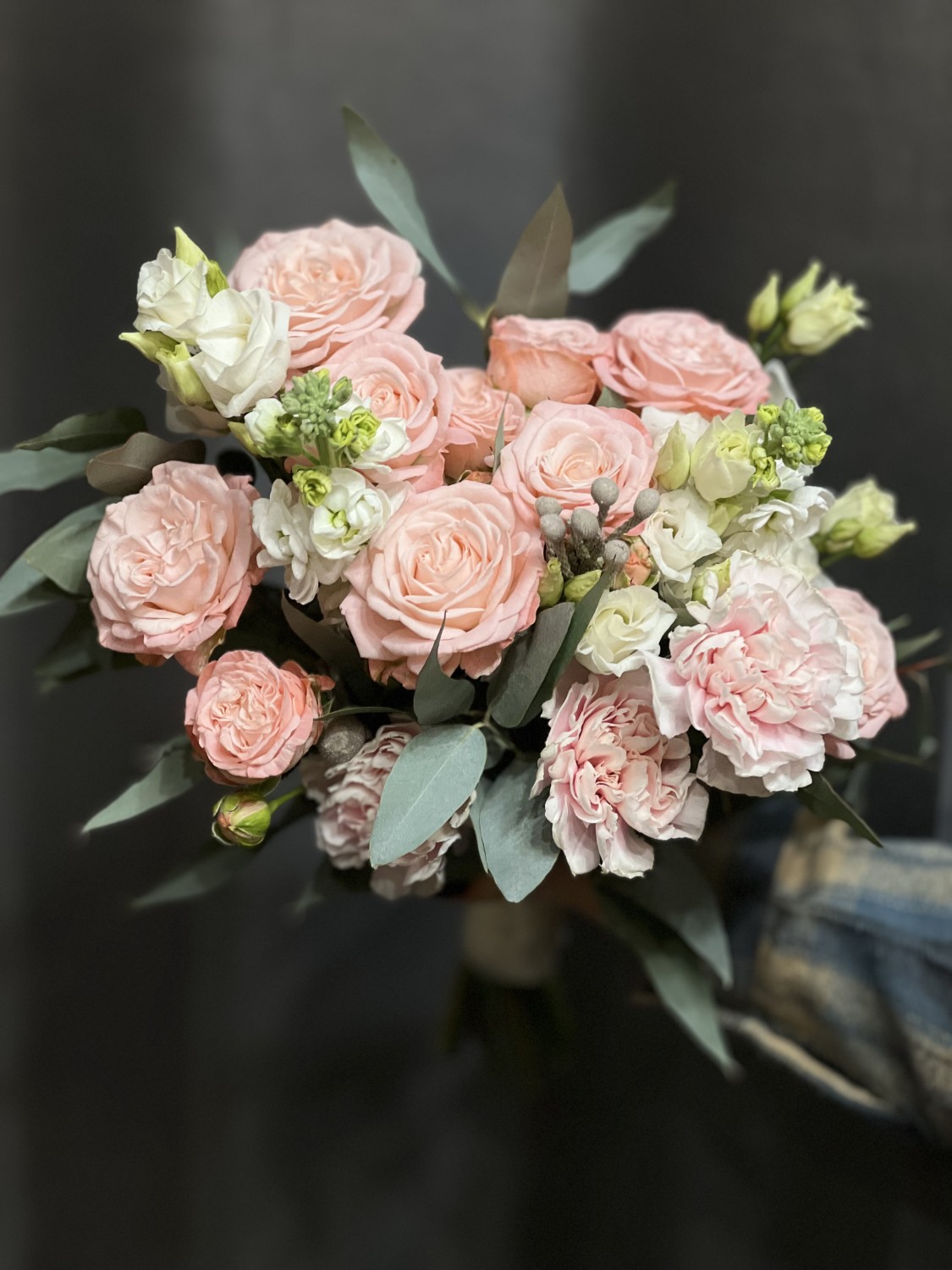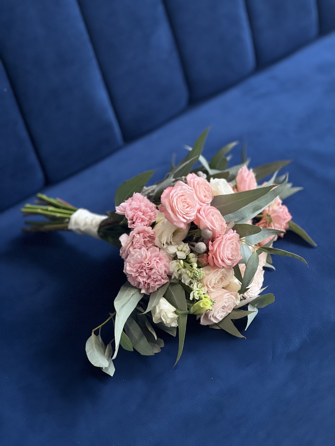 Стильный букет невесты собран из кустовой розы сорта Мадам Бомбастик, белой эустомы и нежнейших диантусов кремово-розового оттенка с добавление веточек эвкалипта и брунии. Раскидистая форма букета выгодно выделяется и дополнит образ.