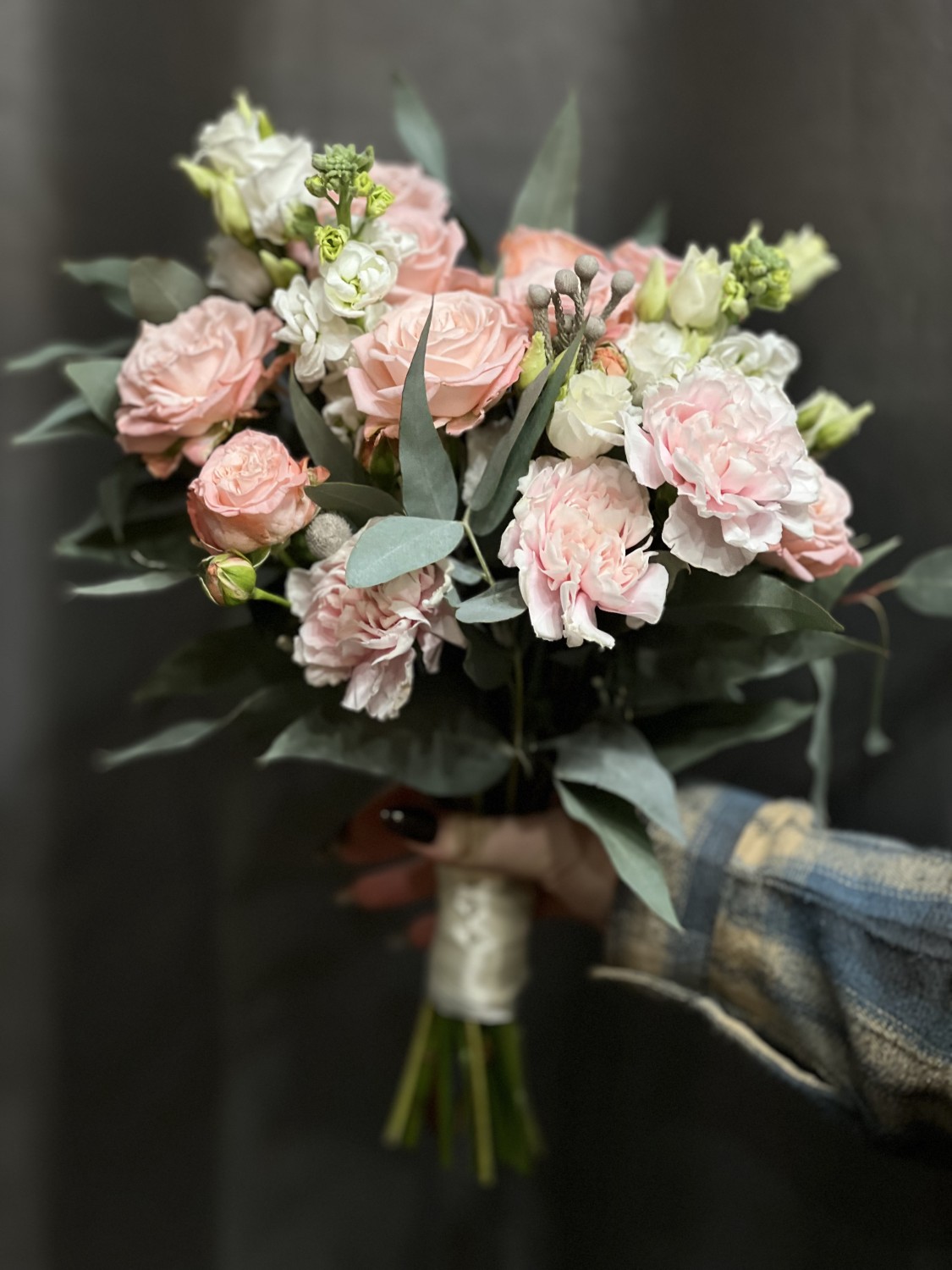 Букет невесты из кустовой розы, нежных диантусов и эвкалипта
