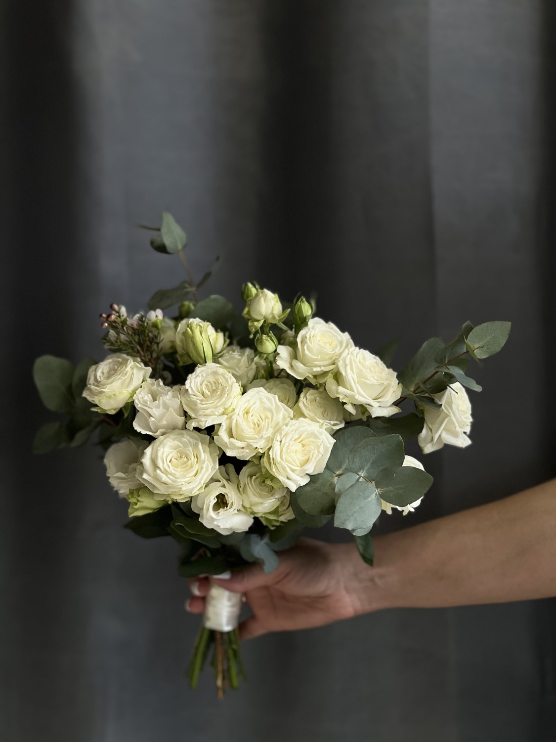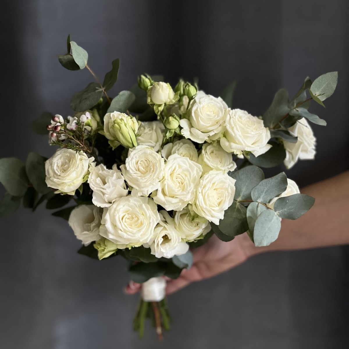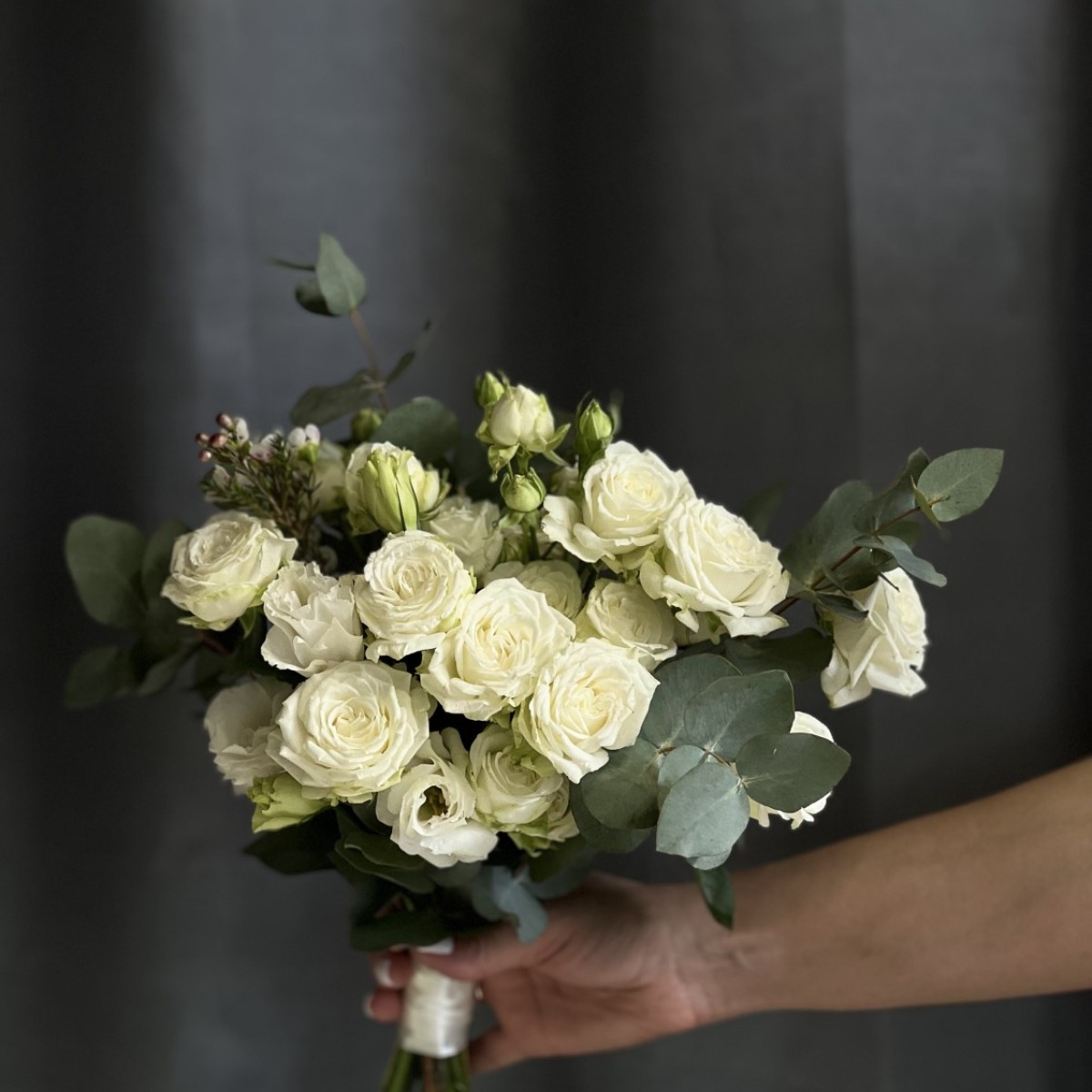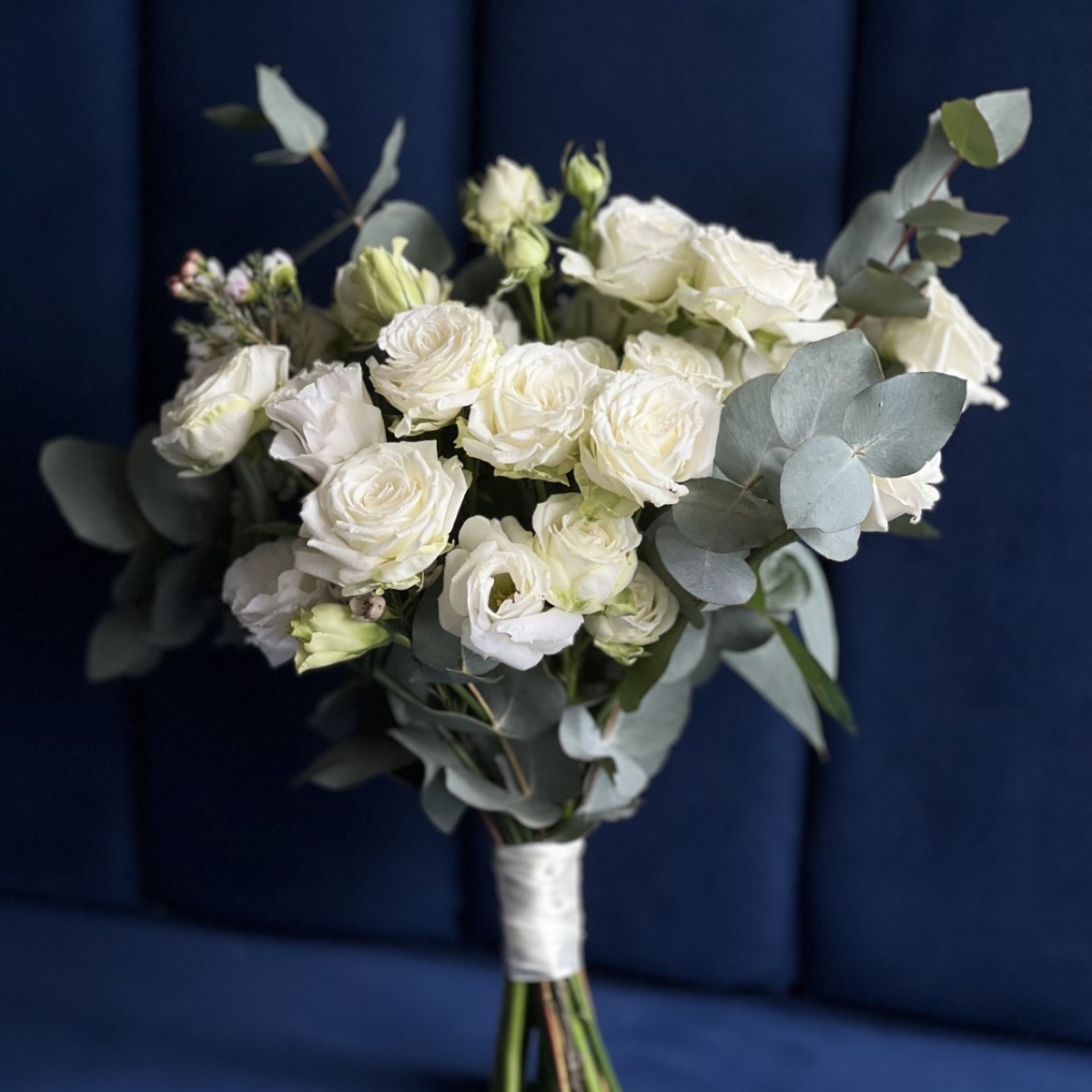 Букет из белой кустовой розы сорта Мисс Бомбастик с добавлением веточек эвкалипта и эустомы, в руках невесты смотрится нежно, трепетно и стильно.