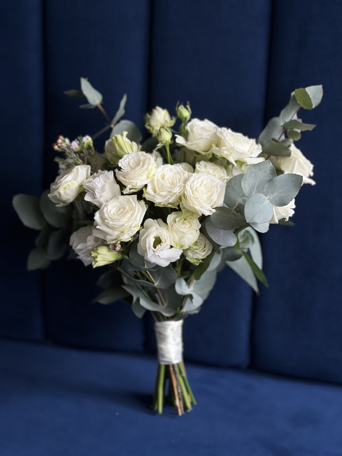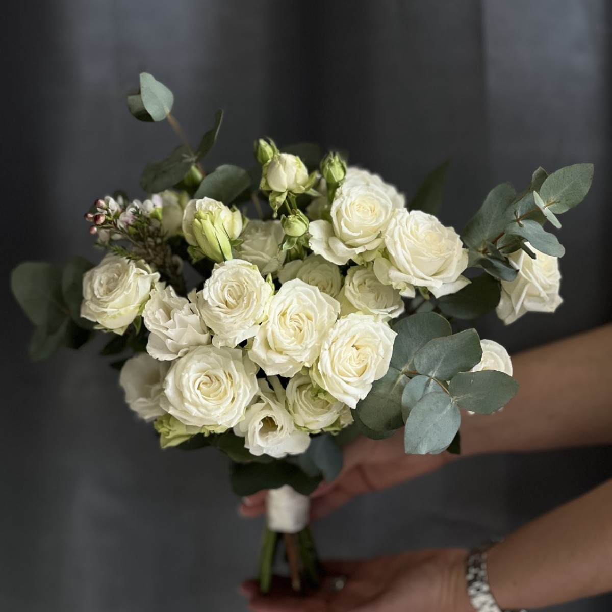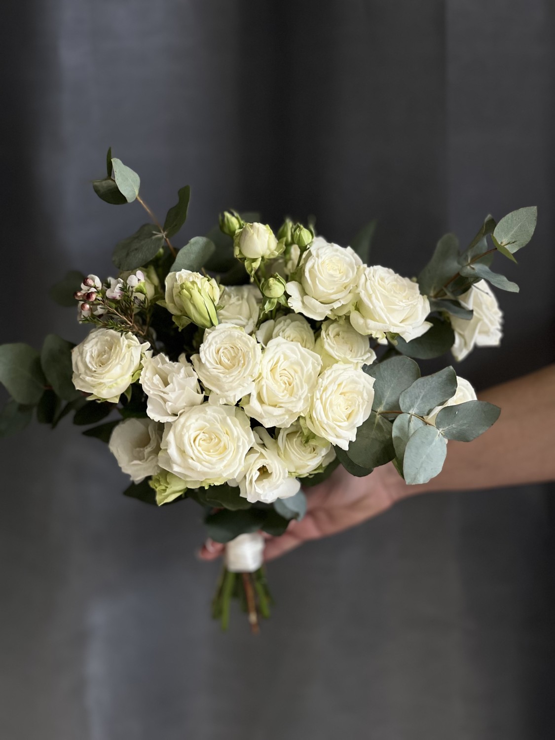 Букет из белой кустовой розы сорта Мисс Бомбастик с добавлением веточек эвкалипта и эустомы, в руках невесты смотрится нежно, трепетно и стильно.