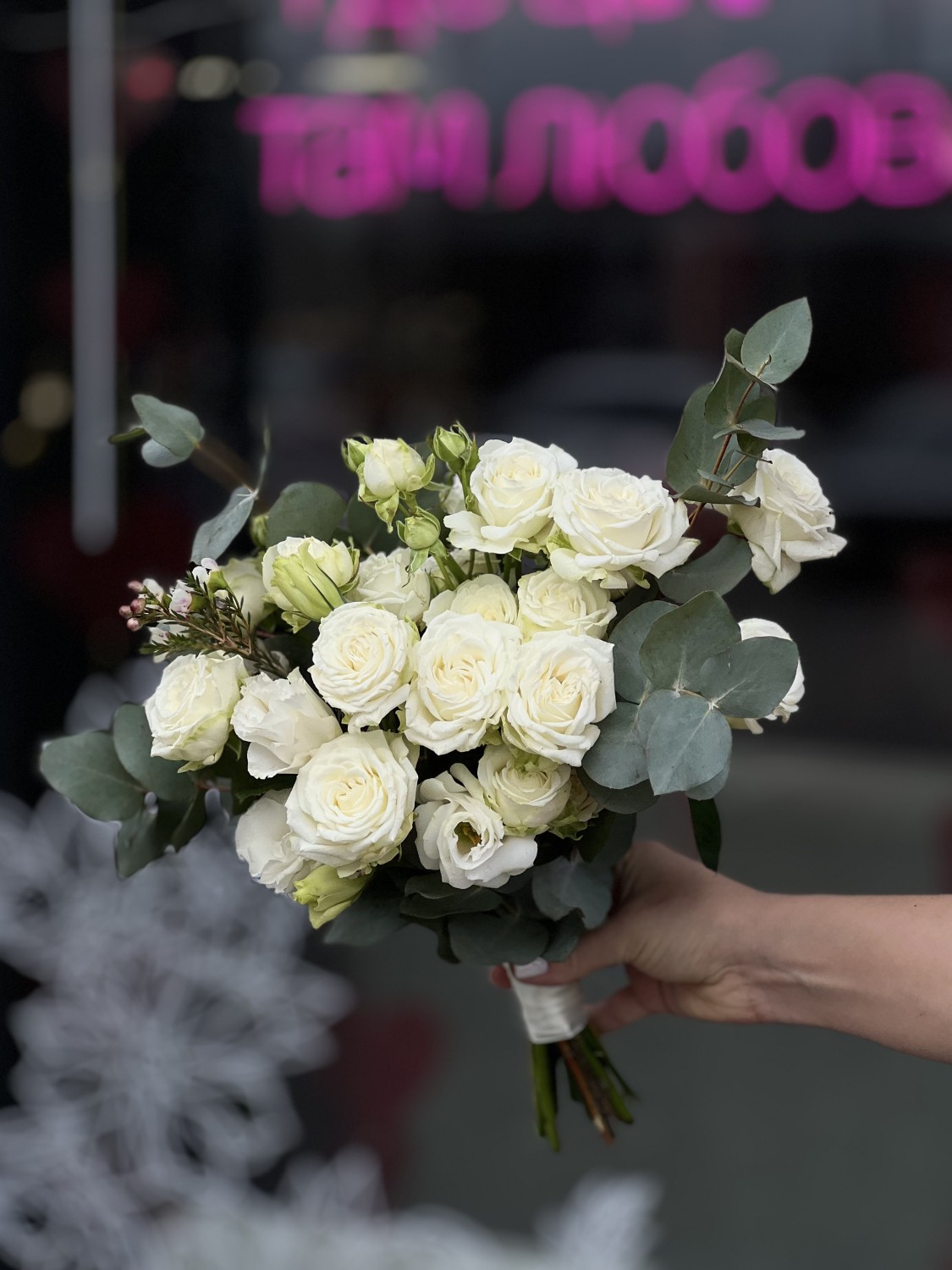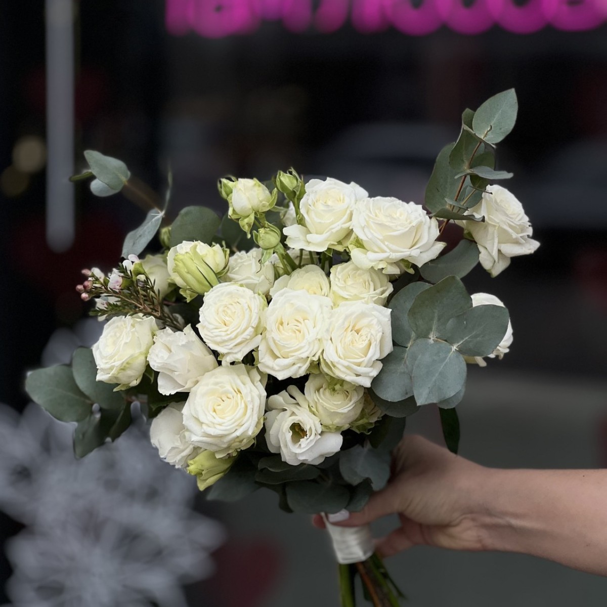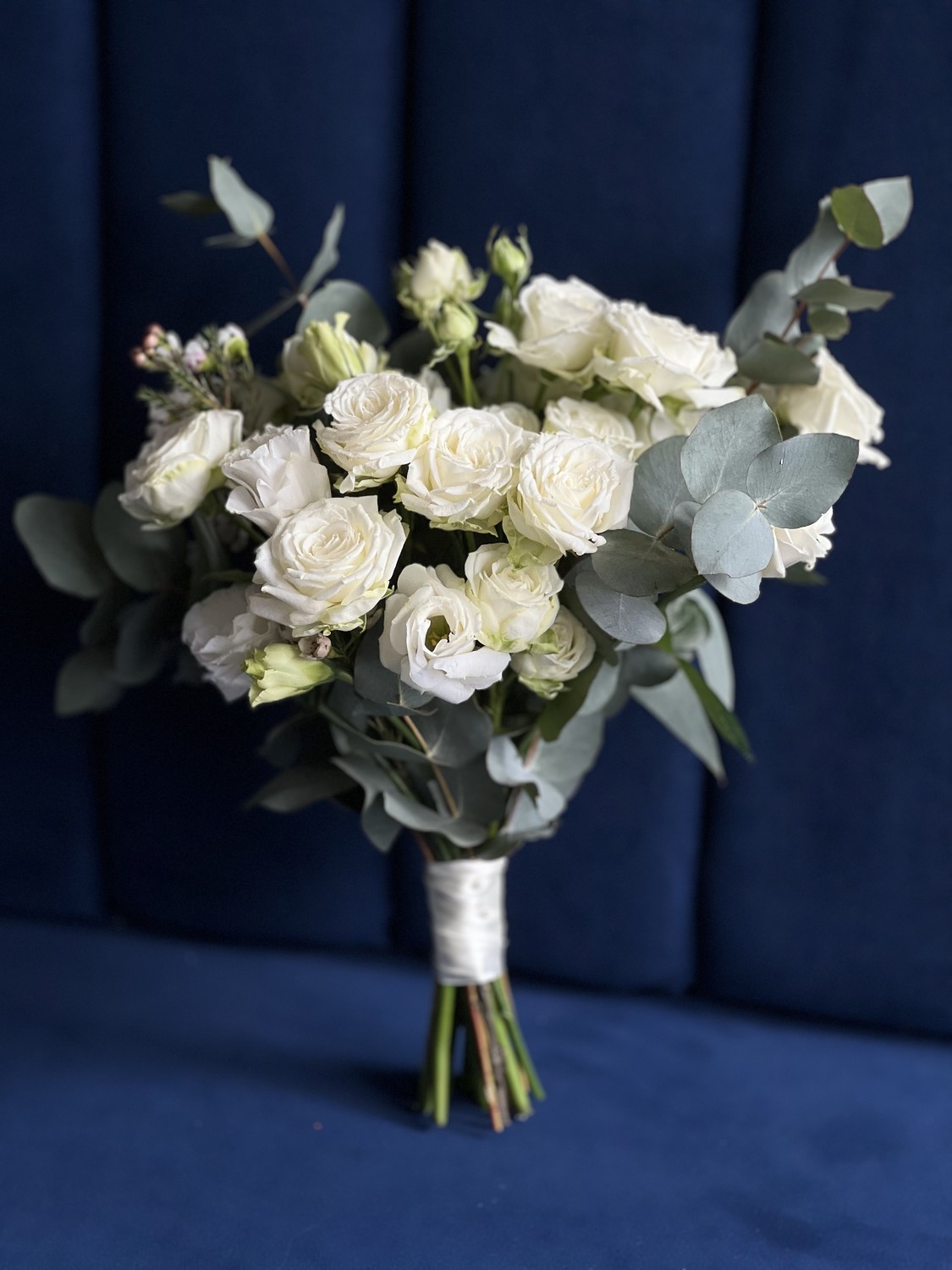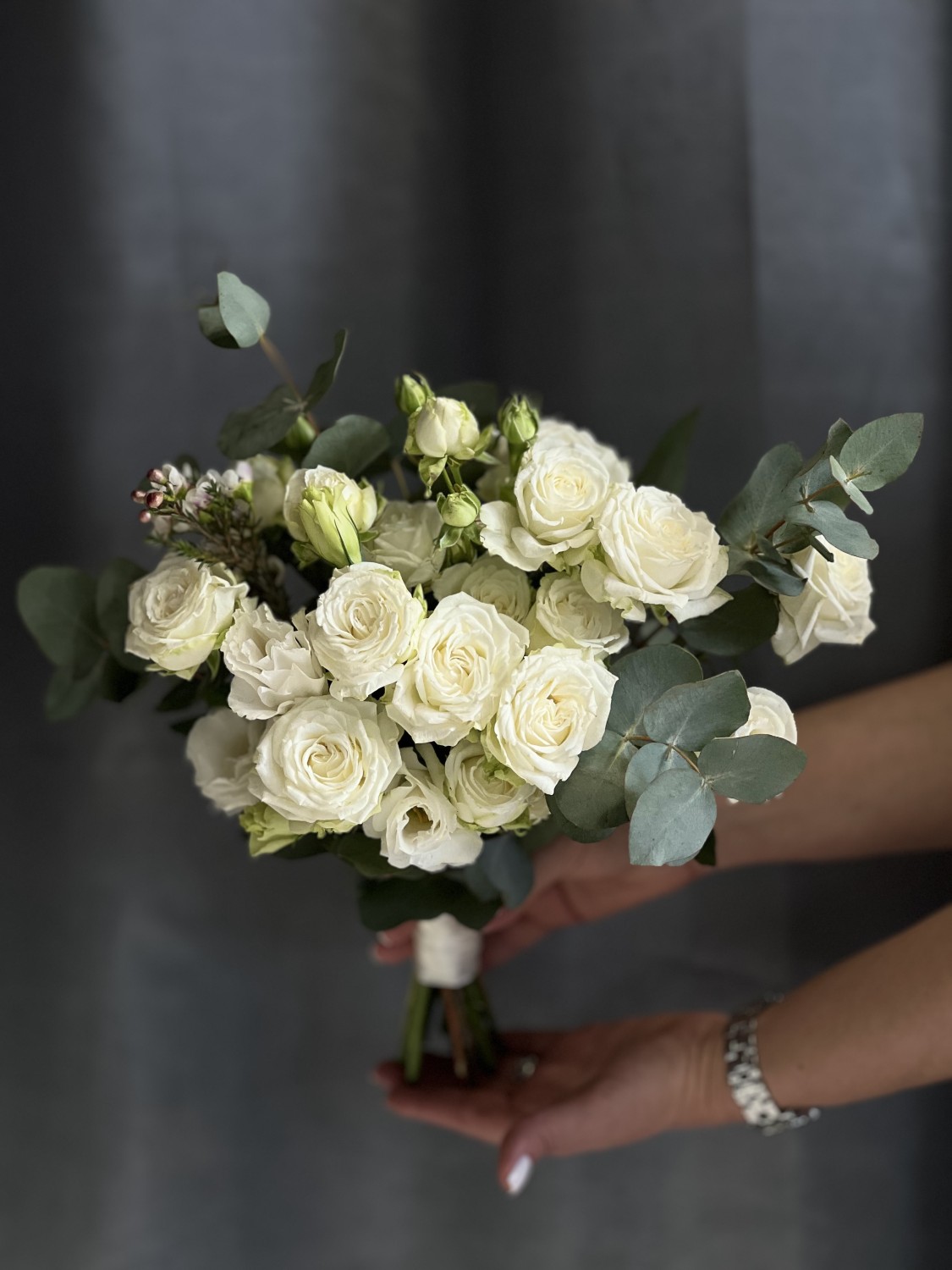 Букет из белой кустовой розы сорта Мисс Бомбастик с добавлением веточек эвкалипта и эустомы, в руках невесты смотрится нежно, трепетно и стильно.
