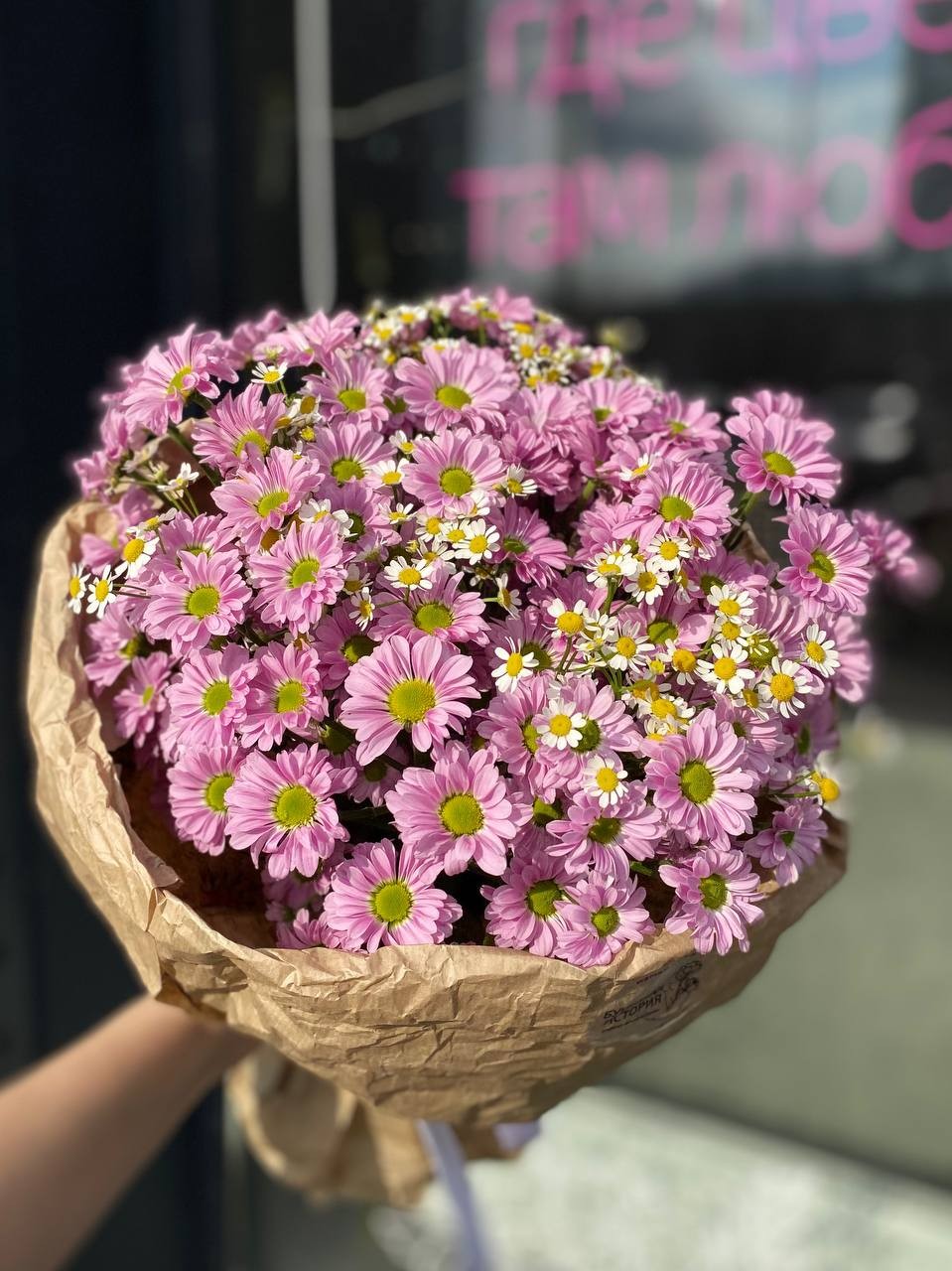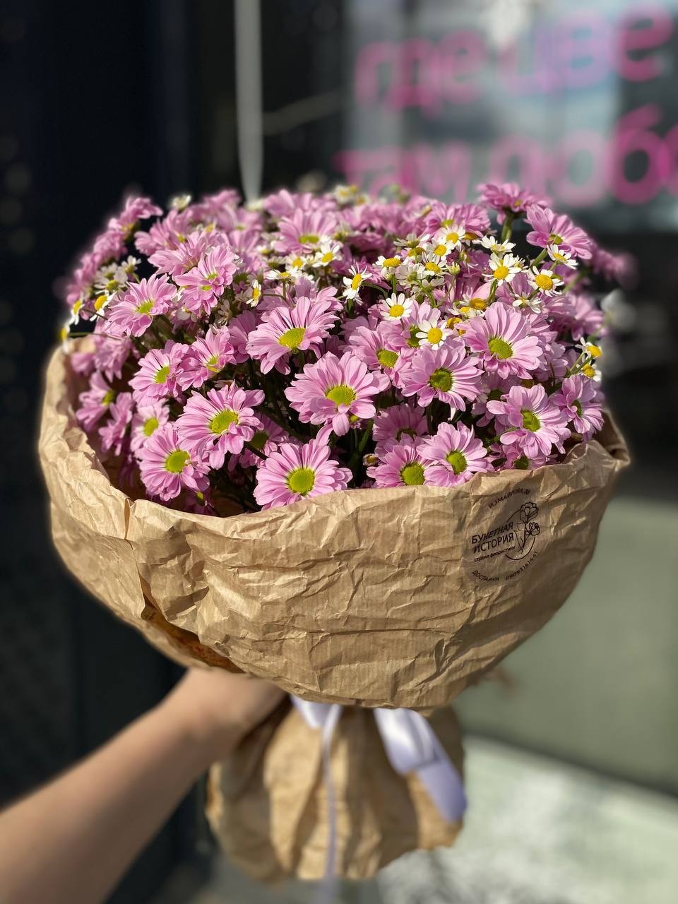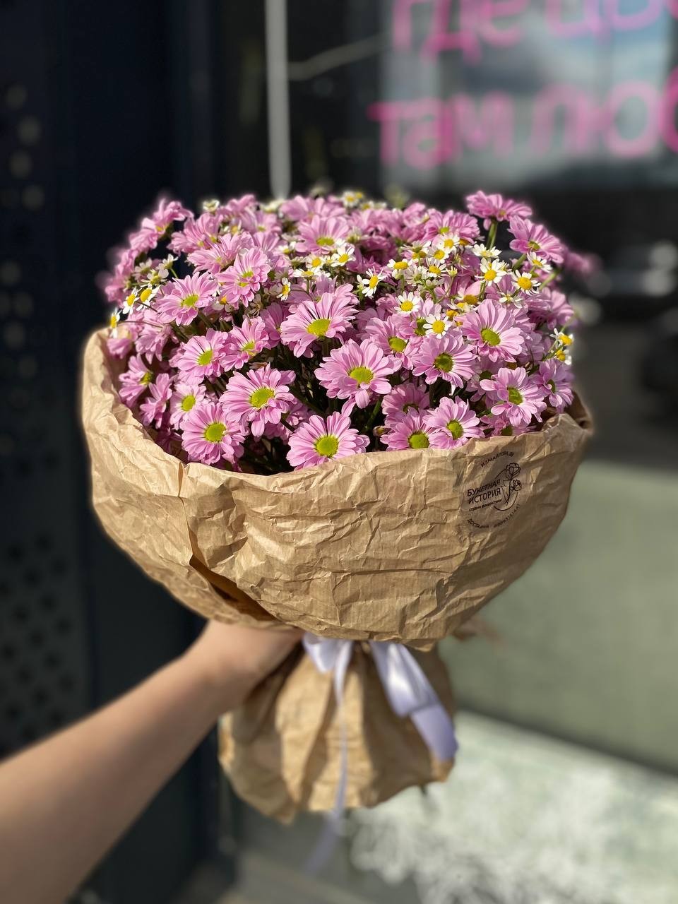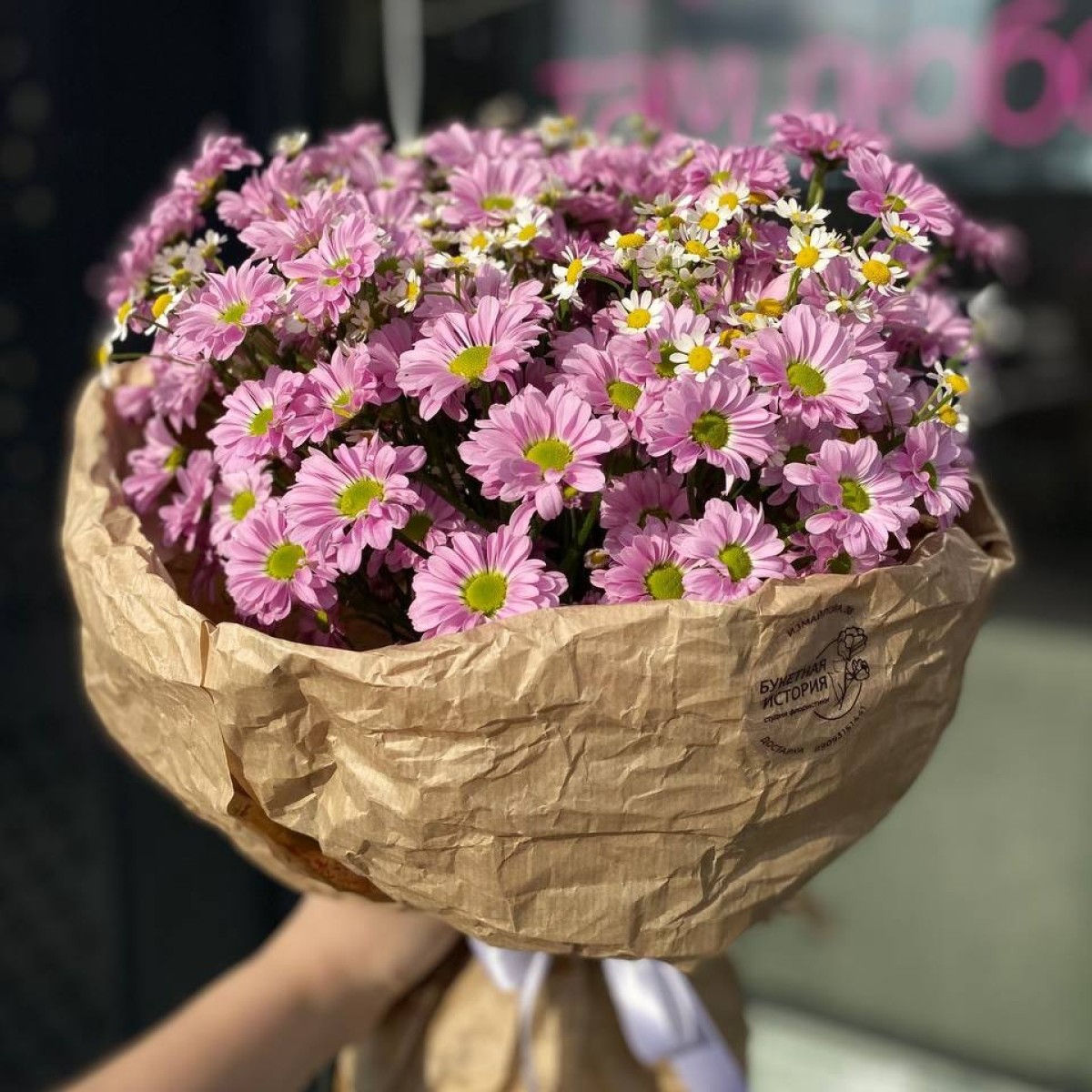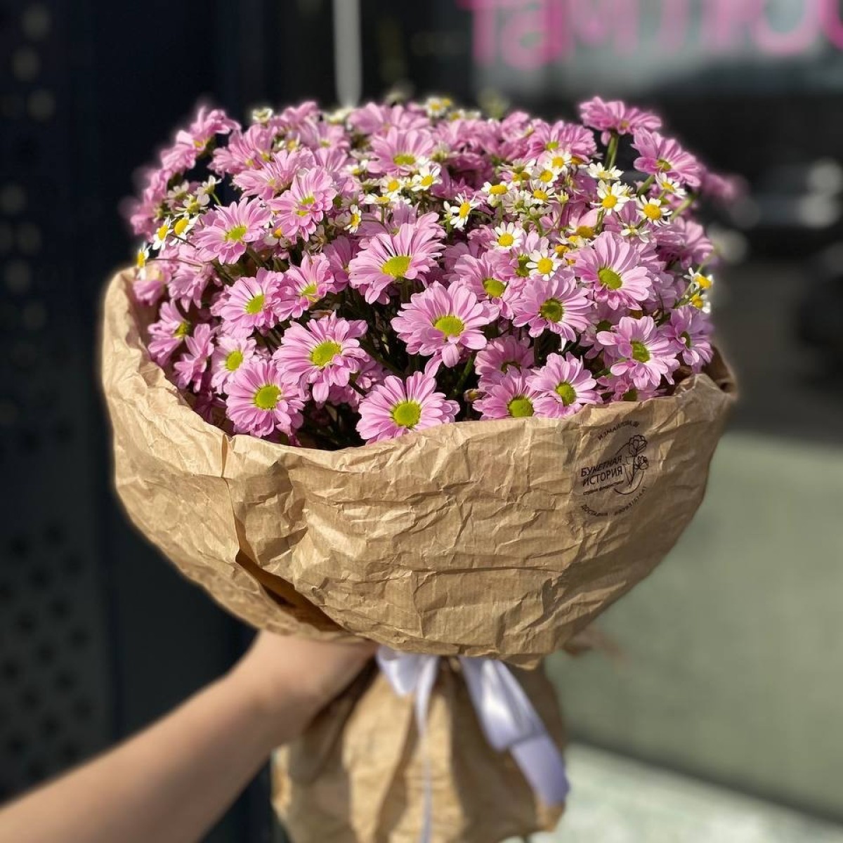 Нежный, воздушный букет из кустовой хризантемы с добавлением матрикарии (ромашки) , напоминающий лето, подойдет на любой повод и даже без. Пользуется особой популярностью, ведь его можно собрать в любом размере от S до XL и в любое время года. Современная крафтовая упаковка.