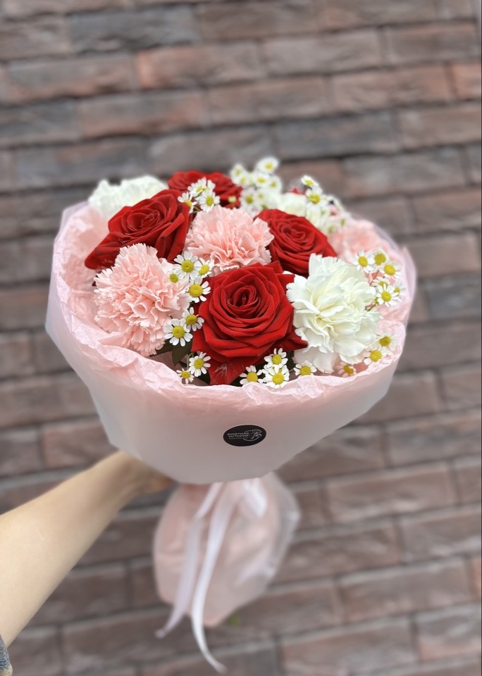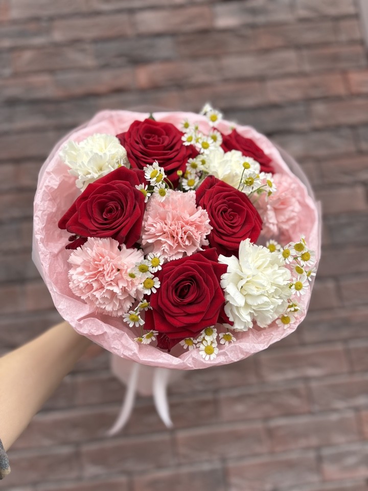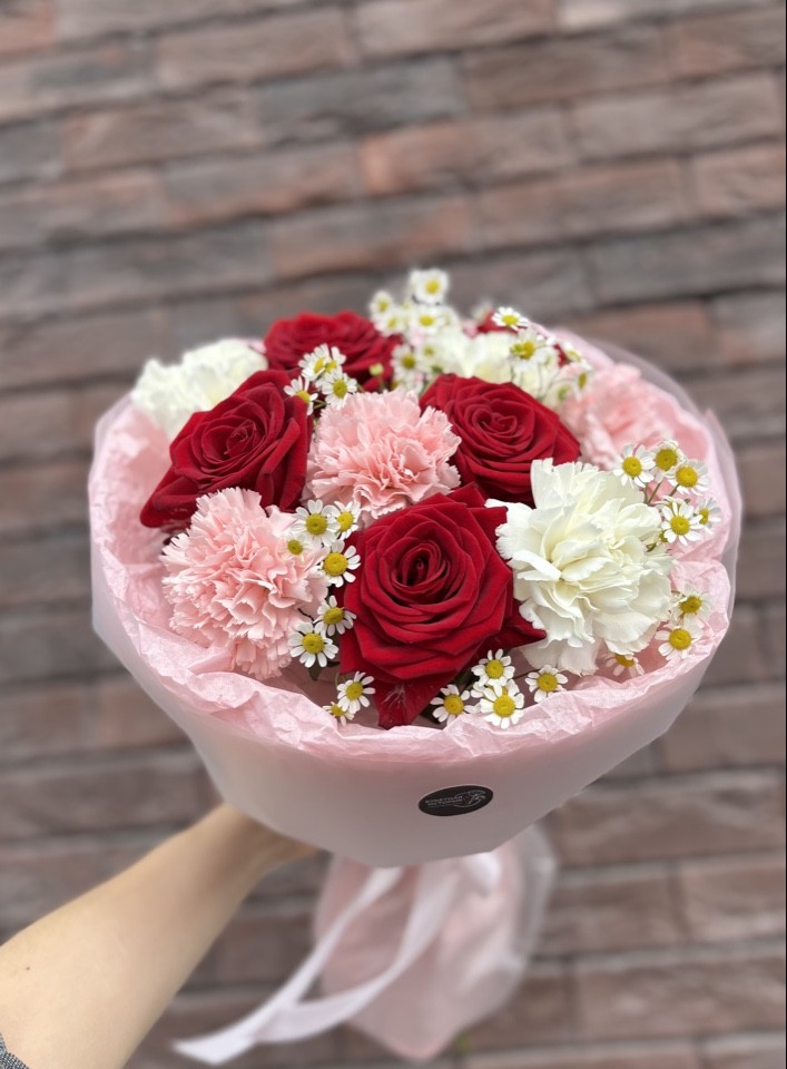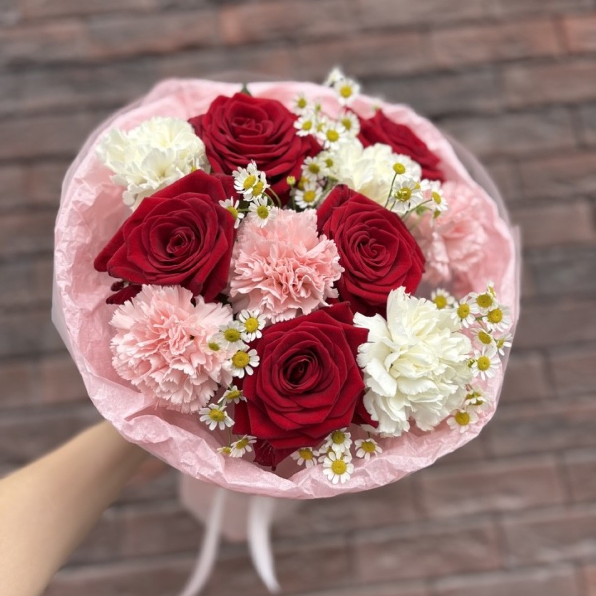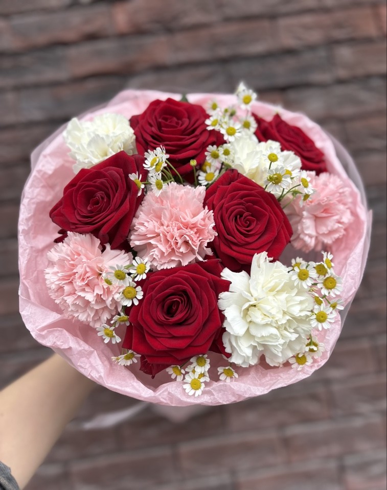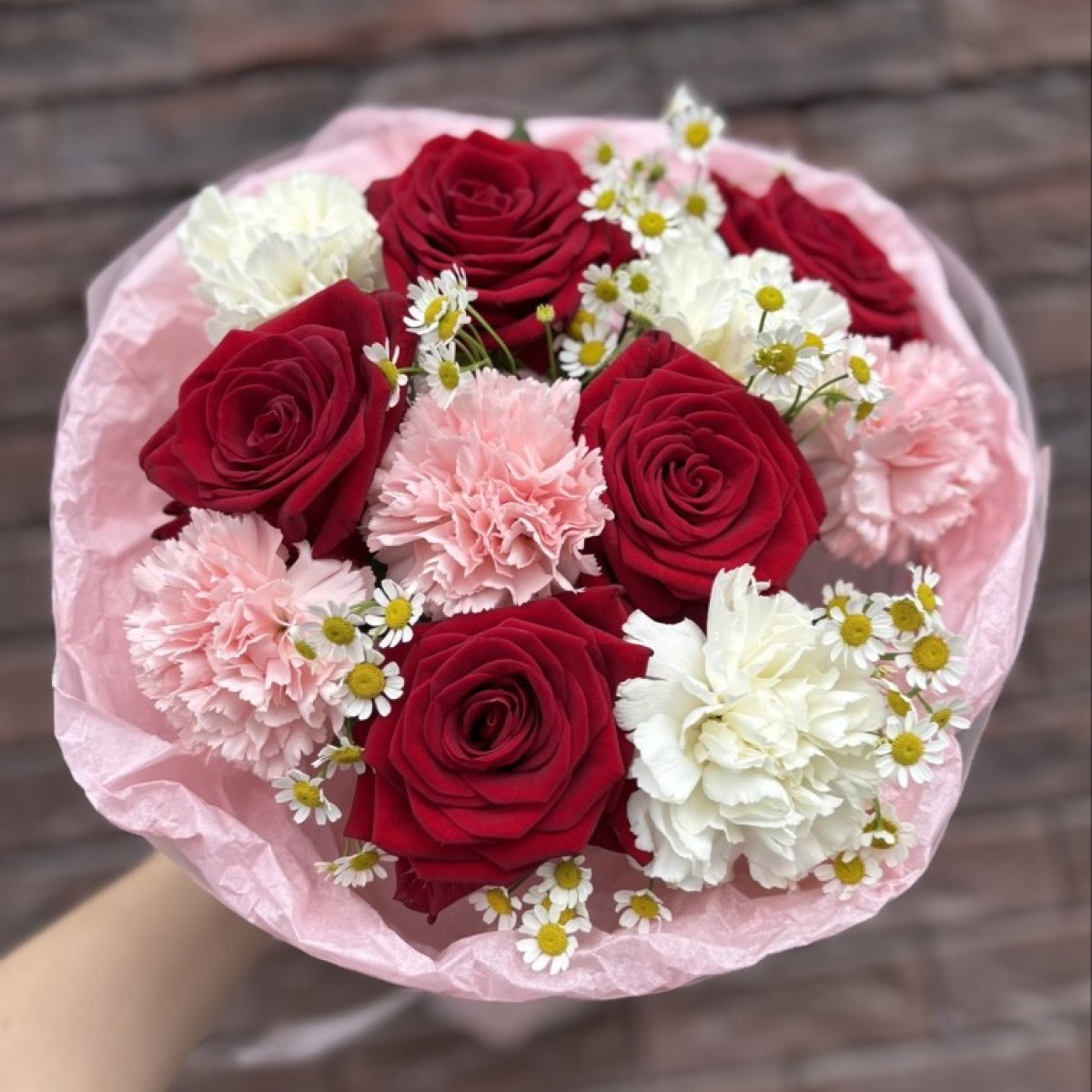 Этот изысканный букет сочетает в себе яркую красную розу, символизирующую страсть и любовь, и нежные диантусы в розовых и белых тонах, которые добавляют нотки романтики и утонченности. Мягкие, воздушные ромашки прекрасно дополняют композицию, придавая ей свежесть и легкость. Такой букет станет великолепным подарком для особого случая или просто для того, чтобы поднять настроение близкому человеку.