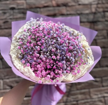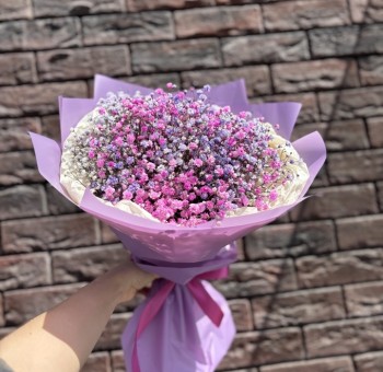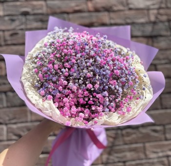 Букет из радужной гипсофилы в розовых оттенках подойдет для подарка любому человеку вне зависимости от пола, возраста или повода. Гипсофила традиционно связана с выражением любви, восхищения и признательности. Она будет долго радовать вас , так как со временем она превратится в сухоцвет, при этом ее соцветия не потеряют своей привлекательности.