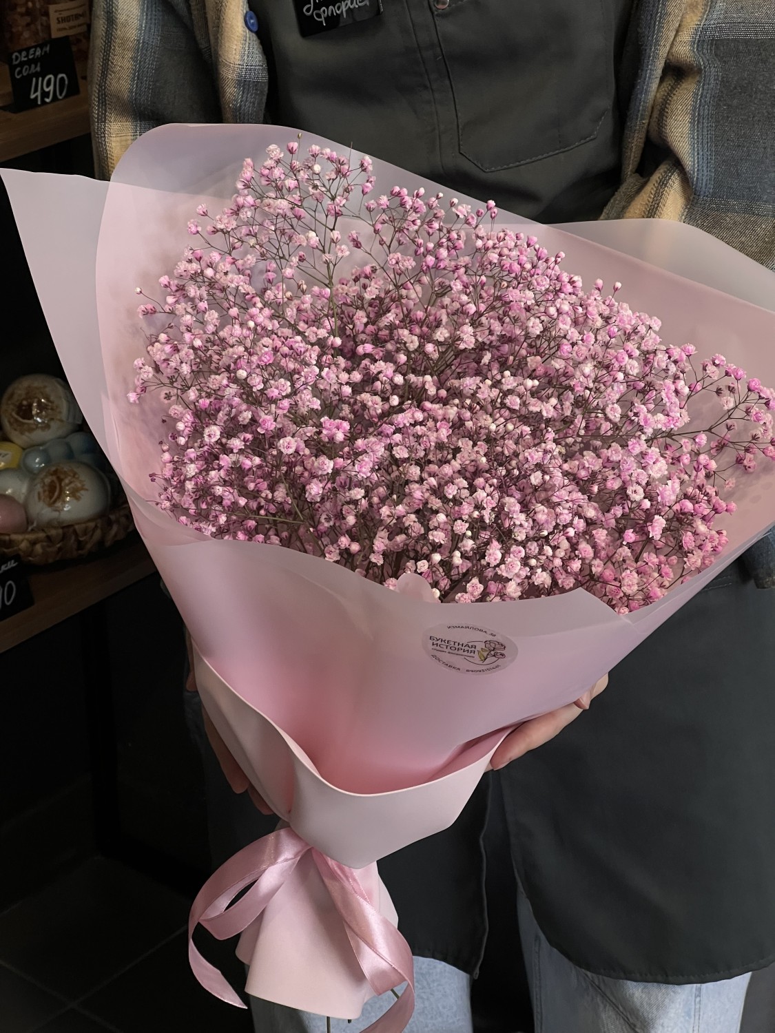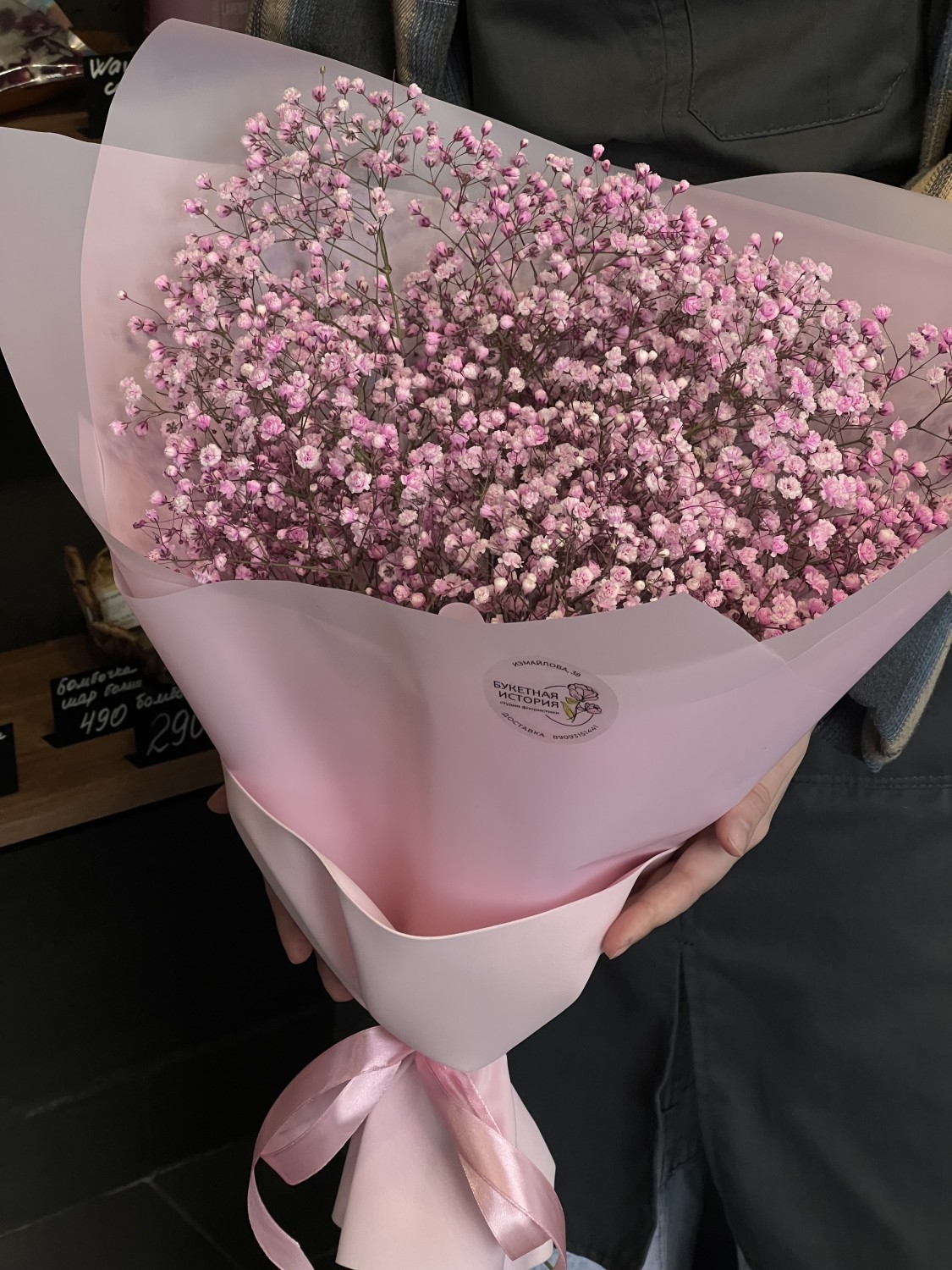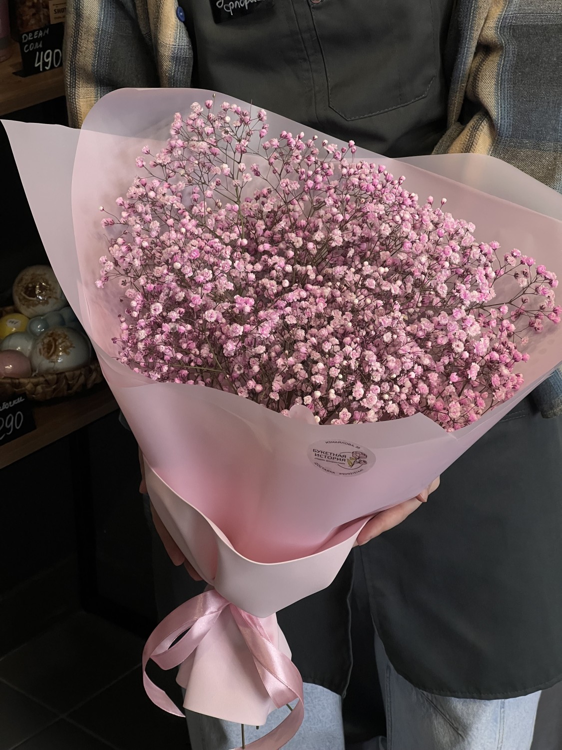Легкий, воздушный букет из цветной гипсофилы. Цветок имеет маленькие соцветия и свою уникальную символику-нежный, чистый, невинный, начало новой жизни, святость и духовность, все это о великолепной гипсофиле на языке цветов. Подходит для любого мероприятия и повода. Упаковка цветная матовая пленка подчеркнет воздушность и нежность букета.