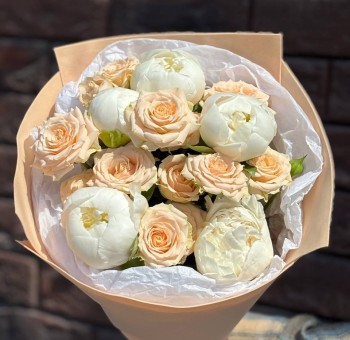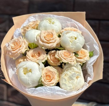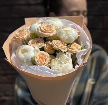 Букет из белоснежной кустовой розы сорта Мисс бомбастик в сочетании лизиантуса , пиона и диантуса с добавлением веточек эвкалипта. Белые розы – это цветы нежности и невинности. Они идеально подходят к свадебному торжеству.