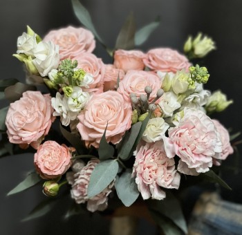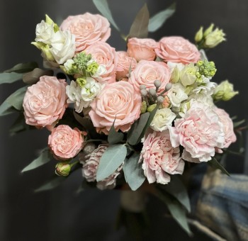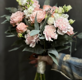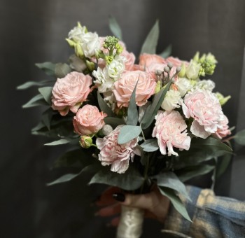 Сборный букет из множества цветов с разными оттенками белого и розового,их элегантность и утонченность подчеркивают красоту невесты, придают особый шарм и создают романтическую атмосферу.