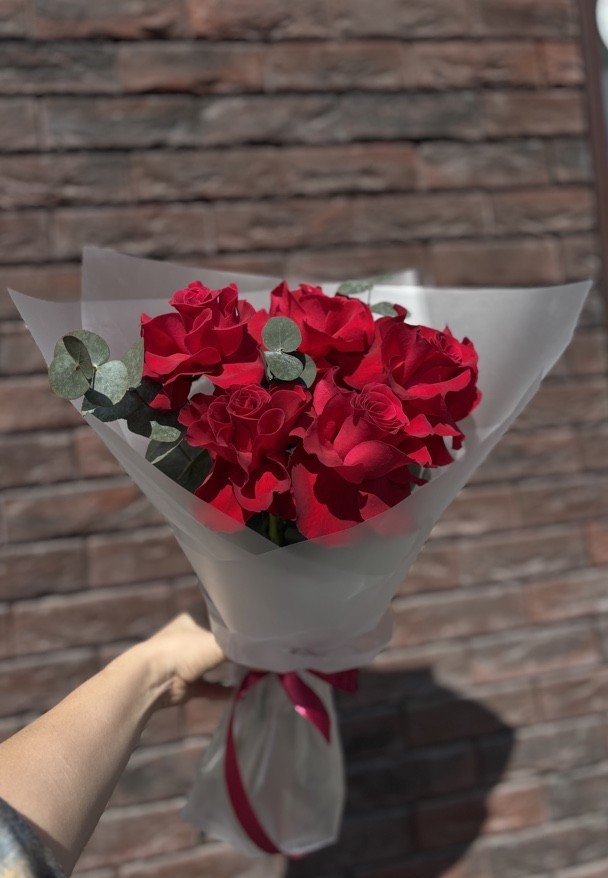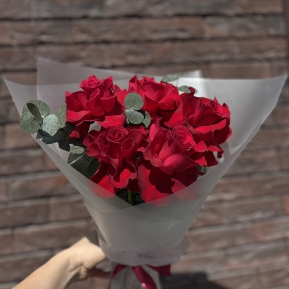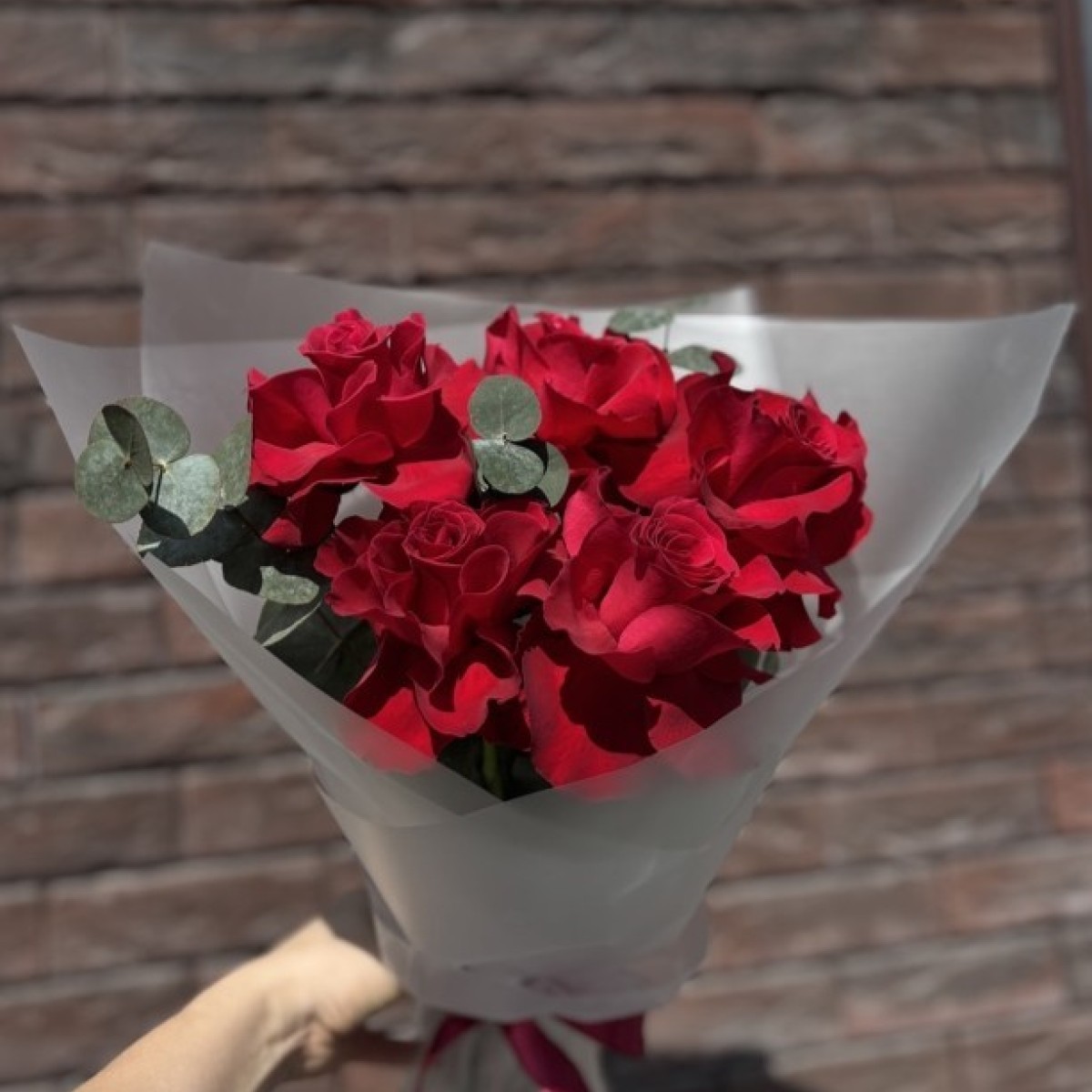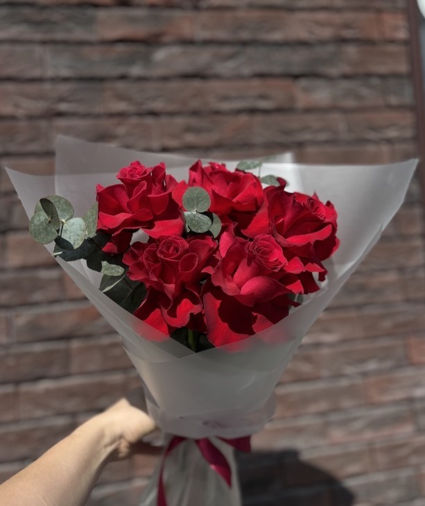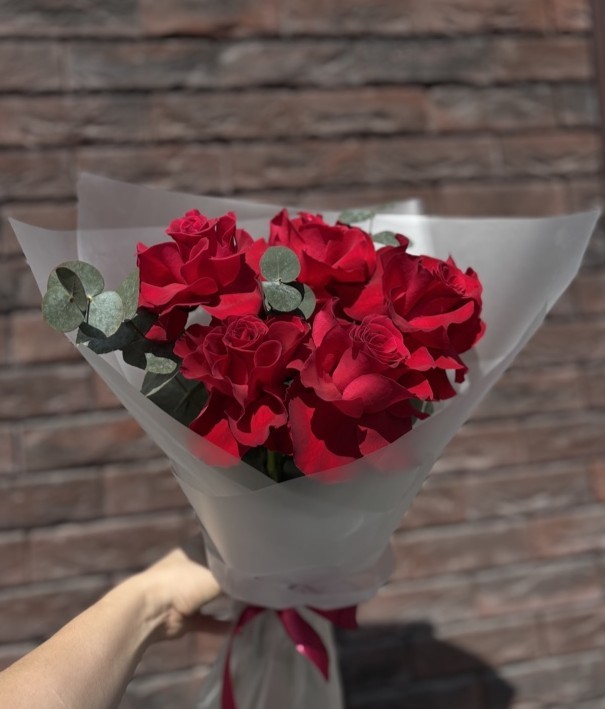 Фрейя Кружевной букет из красных французских роз с эвкалиптом