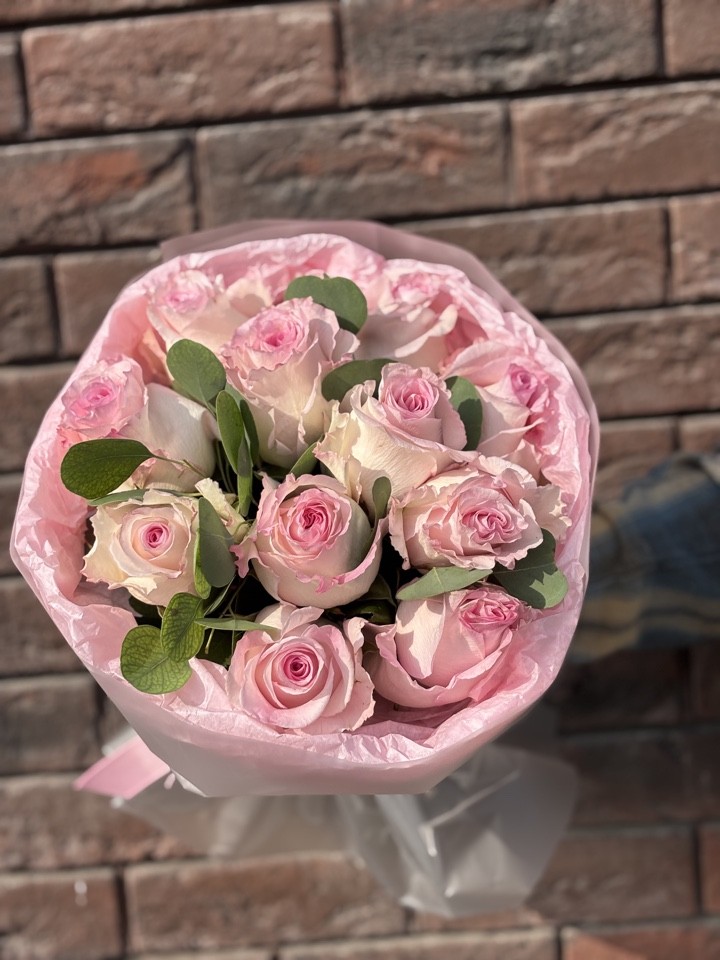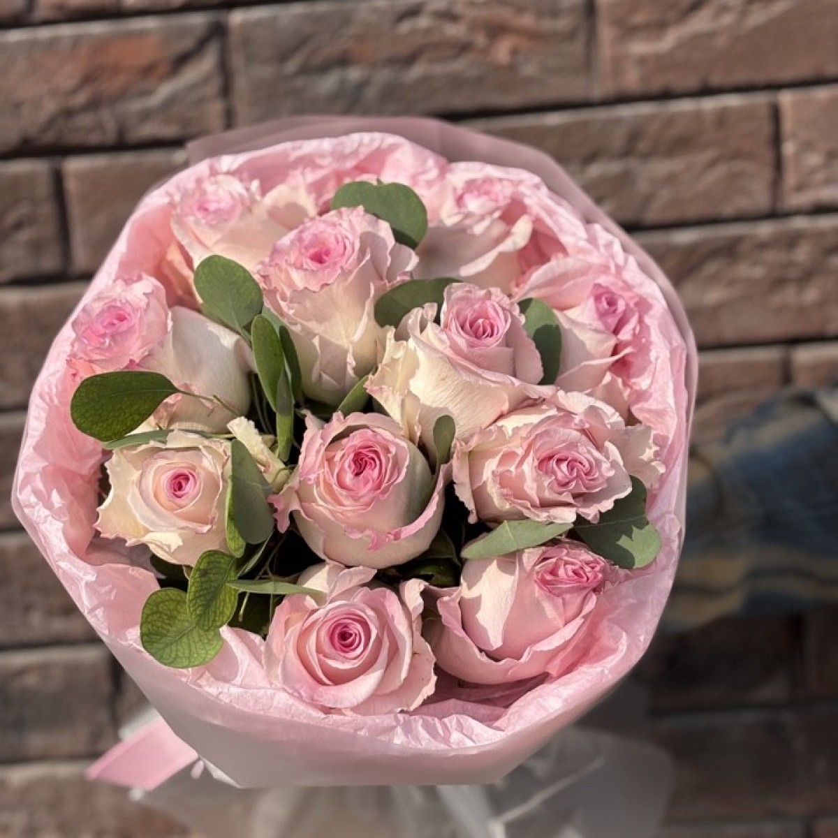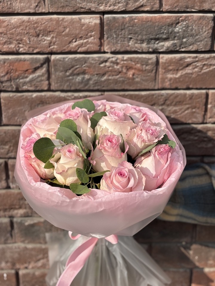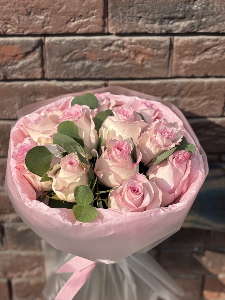 Нежный рассвет Букет из розовых роз с эвкалиптом