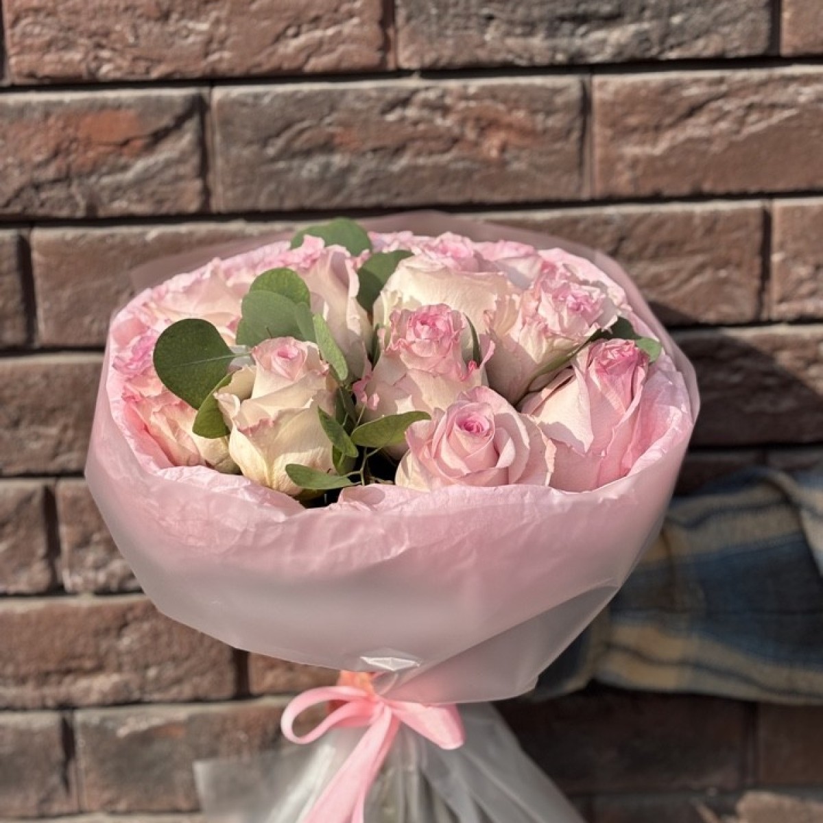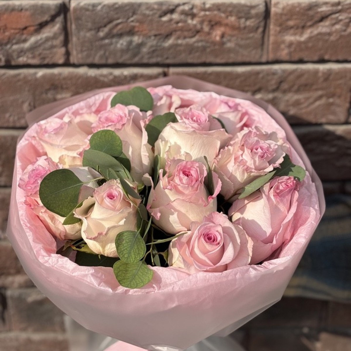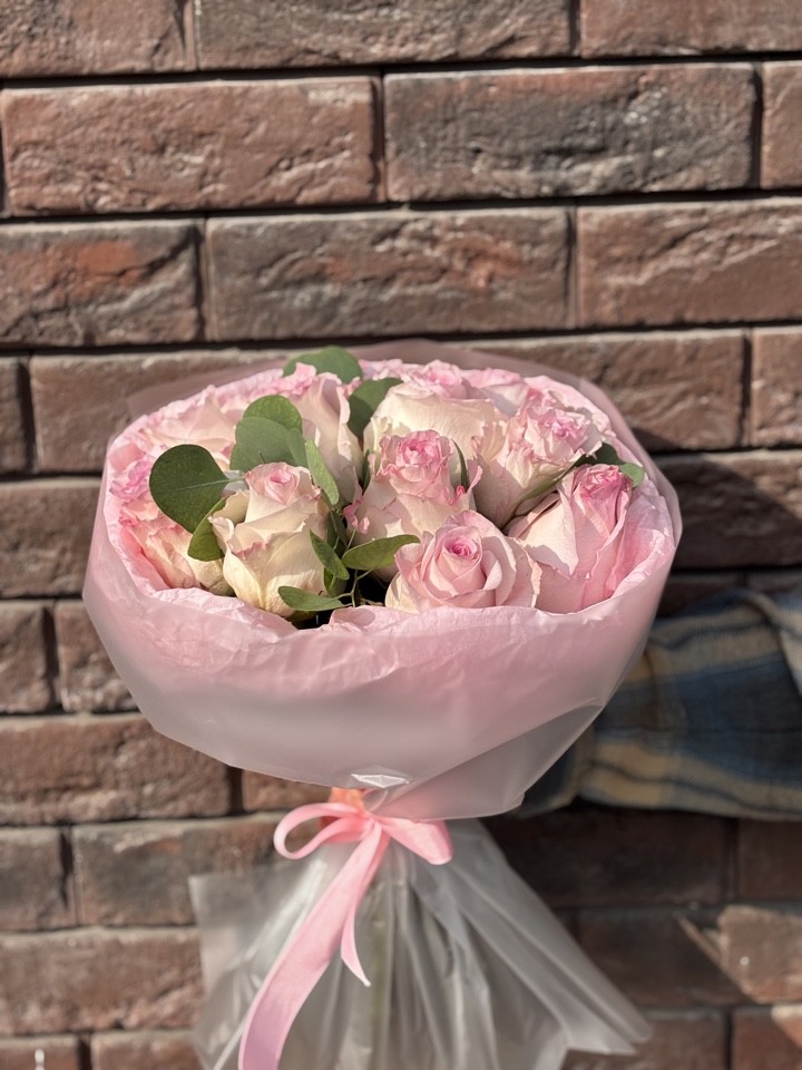 Нежный рассвет Букет из розовых роз с эвкалиптом