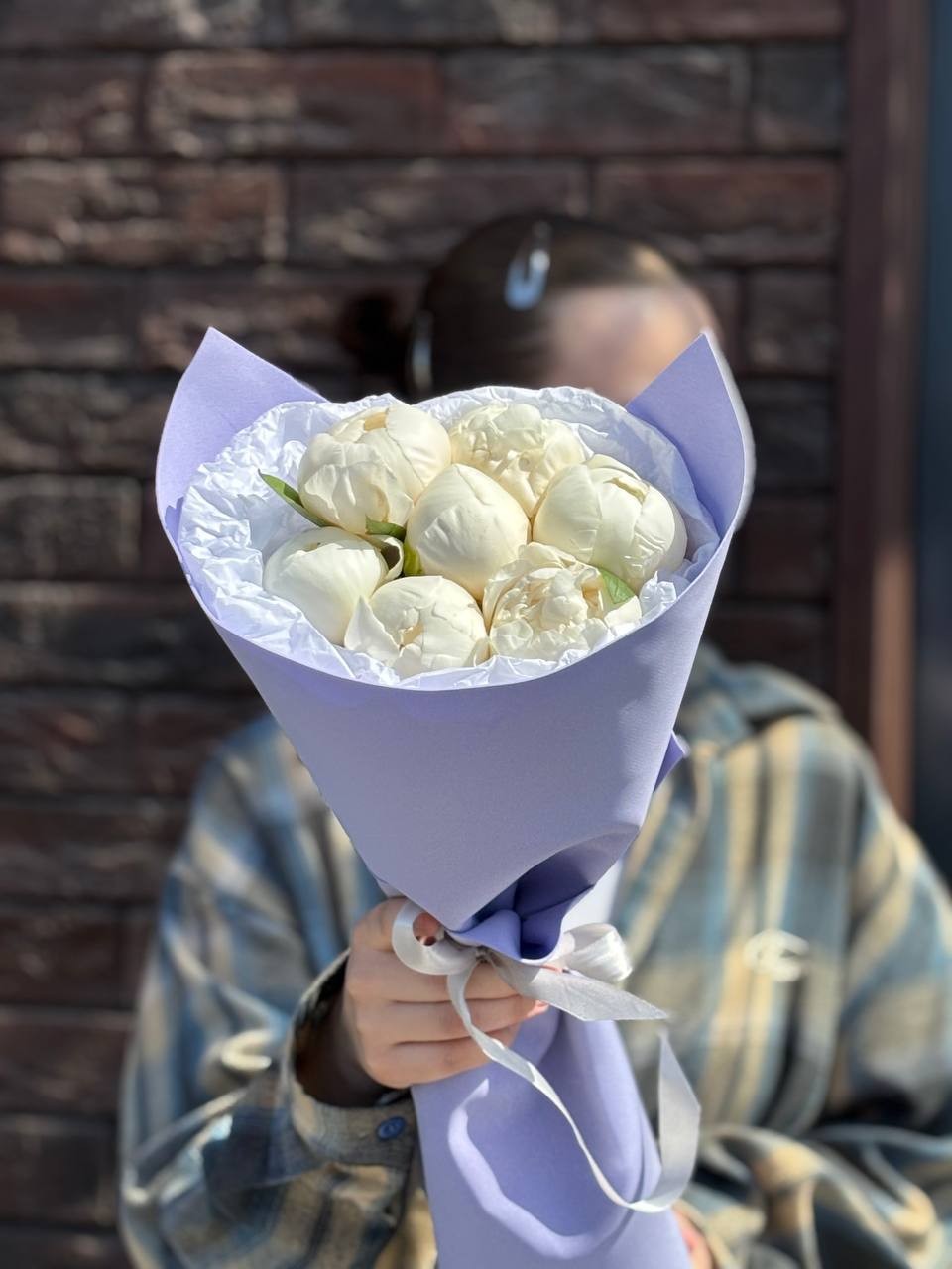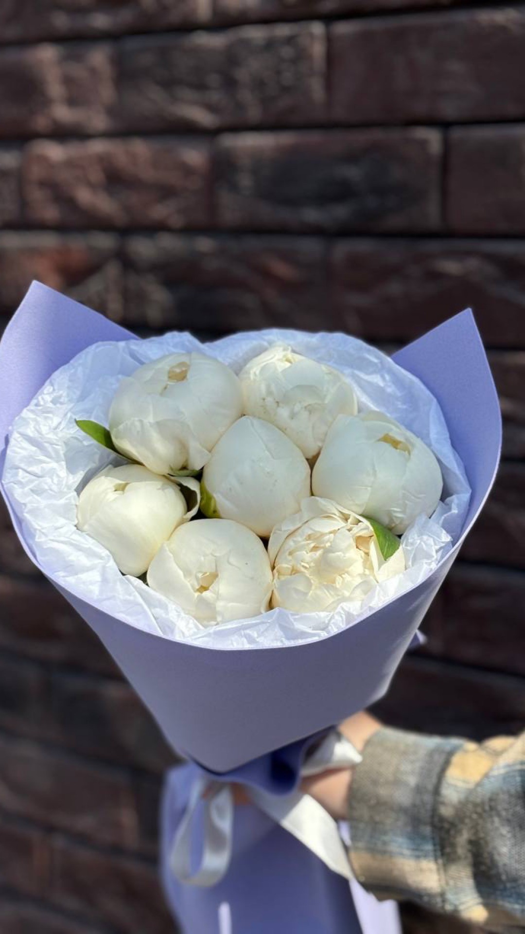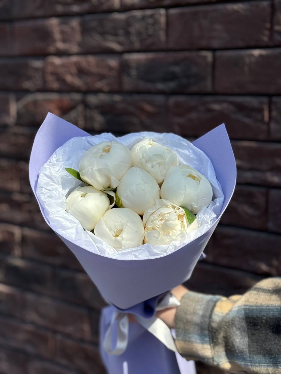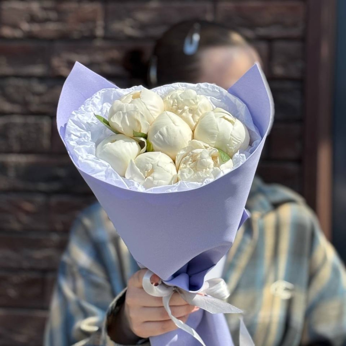 Букет из нежных белоснежных пионов сорта Дюшес де Немур, их пышные формы, благородная текстура лепестков делают букет универсальным подарком для самых разных поводов. Пионы-это всегда послание: нежное, теплое,личное.