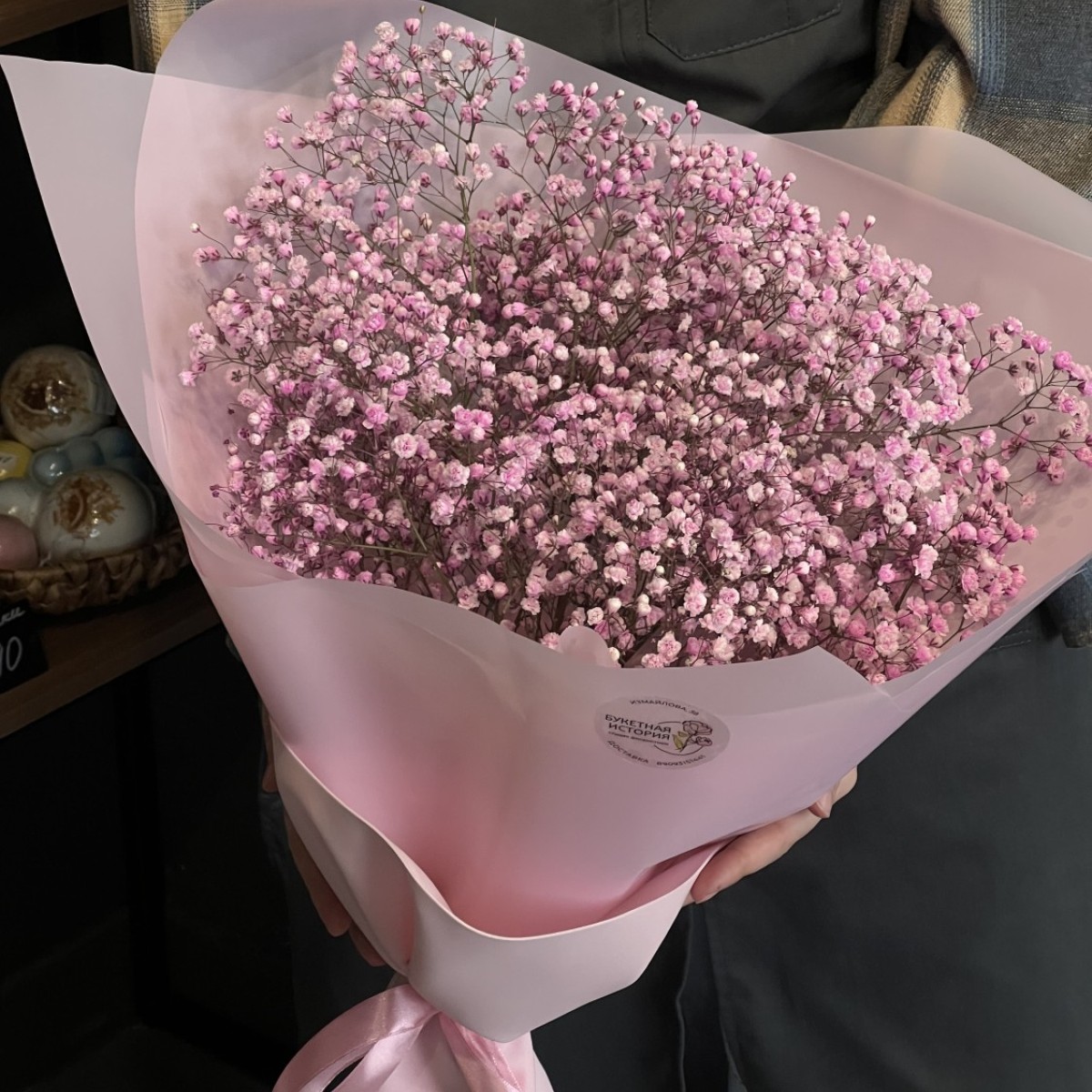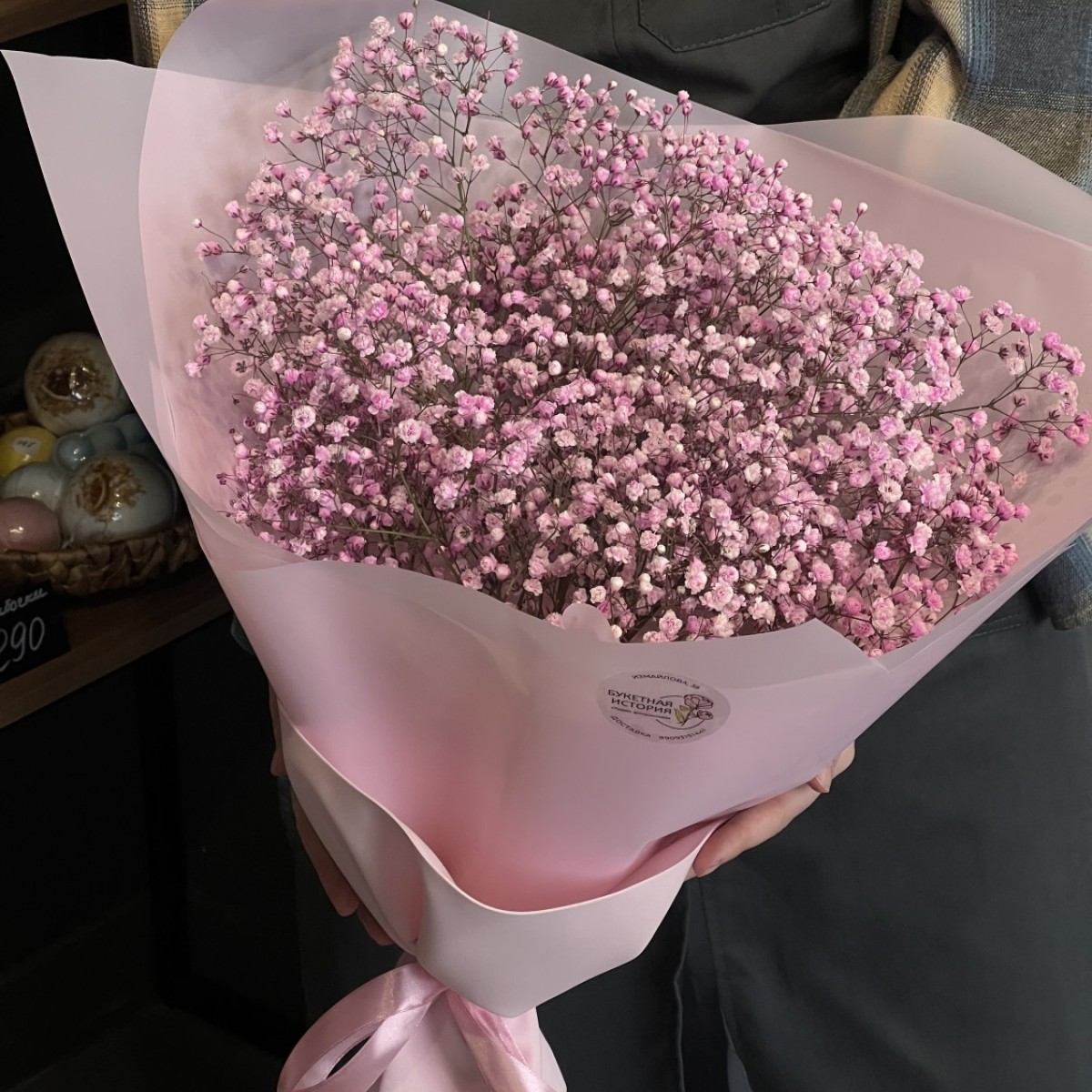 Легкий, воздушный букет из цветной гипсофилы. Цветок имеет маленькие соцветия и свою уникальную символику-нежный, чистый, невинный, начало новой жизни, святость и духовность, все это о великолепной гипсофиле на языке цветов. Подходит для любого мероприятия и повода. Упаковка цветная матовая пленка подчеркнет воздушность и нежность букета.