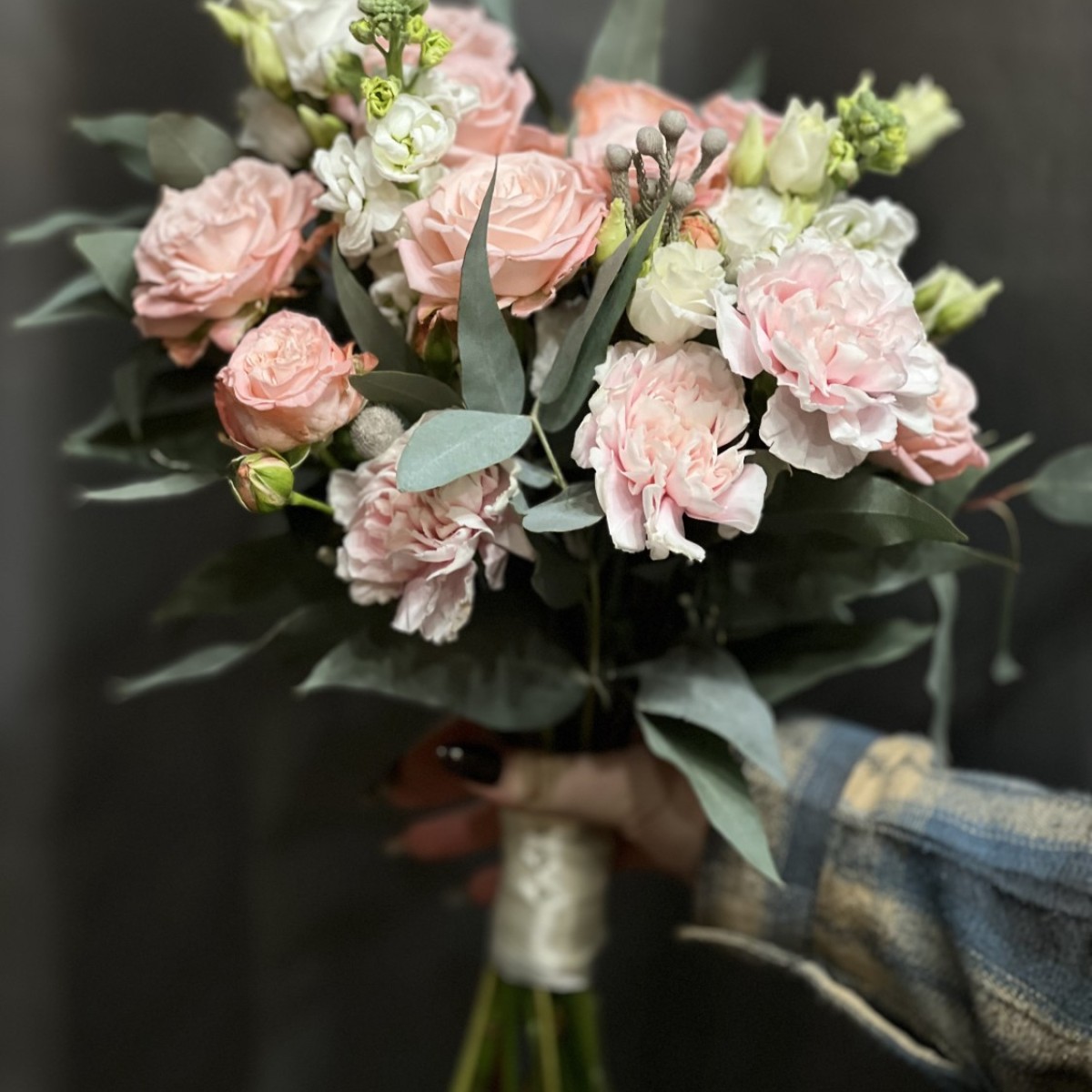 Букет невесты из кустовой розы, нежных диантусов и эвкалипта